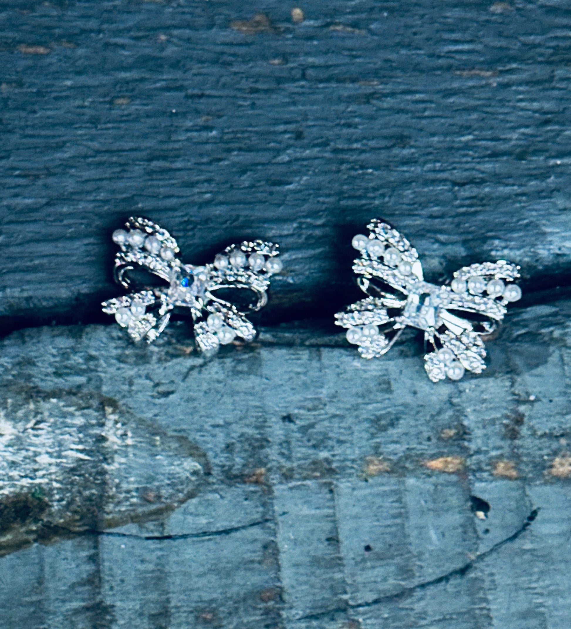 Get ready to turn heads with our AK earrings! Made with silver and pearl, these earrings feature a playful ribbon bow design and are adorned with sparkling cubic zirconia and pave rhinestones. Add a touch of glamour and fun to any outfit with these quirky and unique earrings.