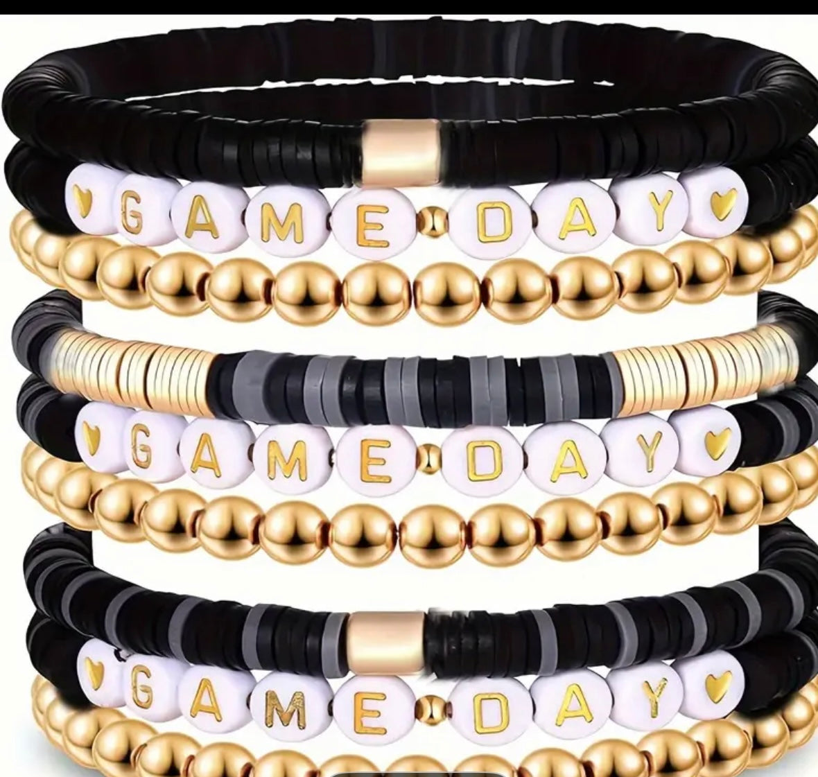 Elevate your game day look with our Black Game Day bracelet set! With 9 bracelets in coordinating gold and black, you can wear them together or separately to show off your team spirit. Upgrade your style and cheer on your team with this versatile accessory set.