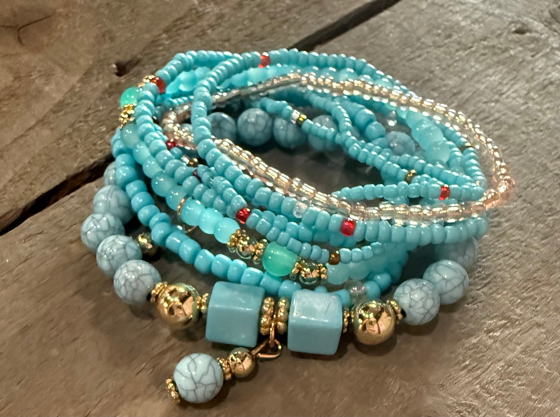 Introducing Blue Days, the perfect arm candy for any occasion. This set of 8 beaded bracelets is sure to add a touch of elegance and style to any outfit. Whether you're dressing up for a special event or looking to add a pop of color to your everyday look, Blue Days has got you covered.