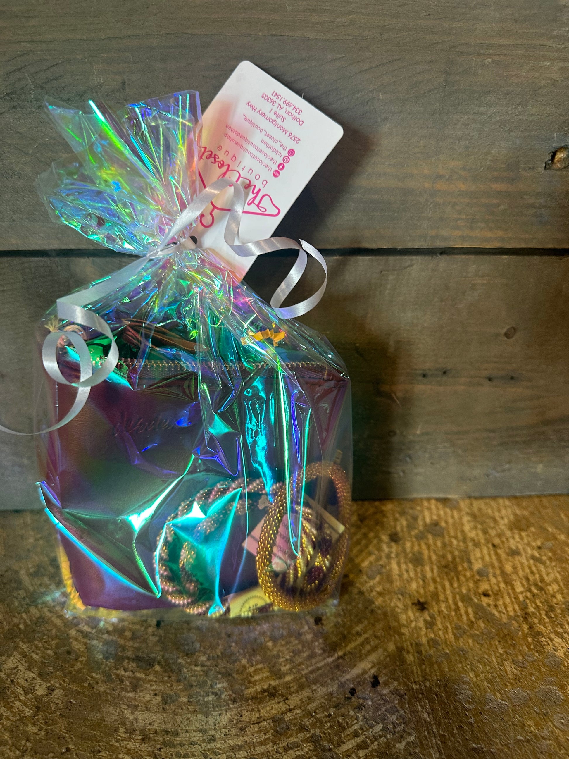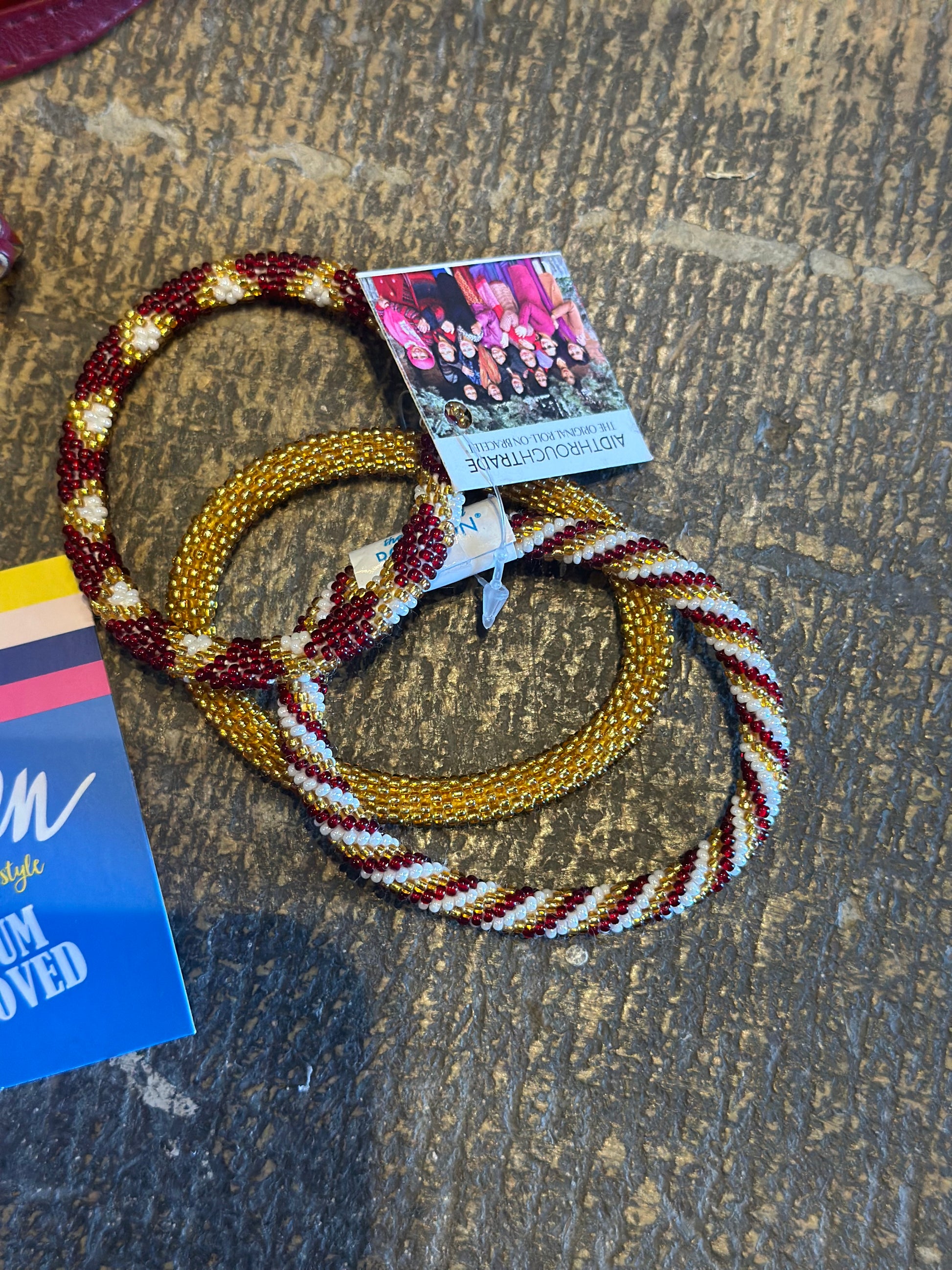 Effortlessly show off your team spirit with our Burgundy Gift set! This bundle includes a stylish game day wristlet and 3 roll-on bracelets in gold, white, and burgundy. Perfect for any fan, these accessories will elevate your game day outfit and make a bold statement. Go team!