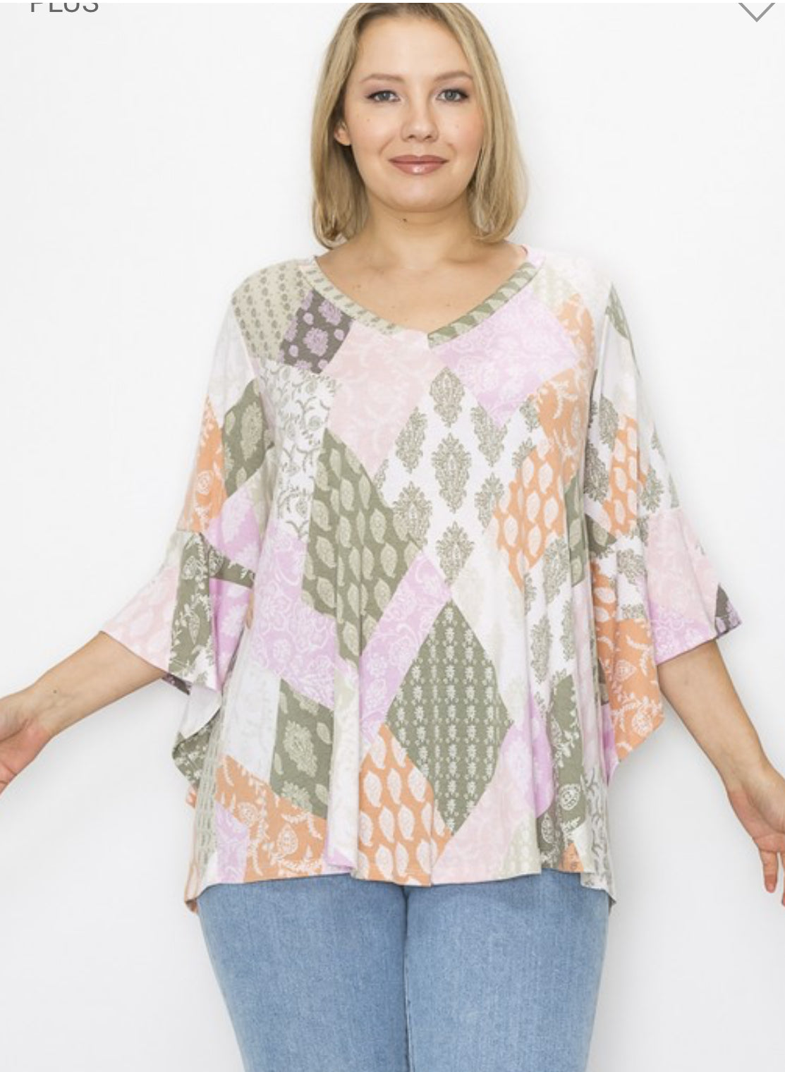 Upgrade your wardrobe with Cassidy, the perfect combination of style and comfort. Featuring a multi-color patchwork design and a flattering v-neckline, this 3/4 sleeve top will add a touch of elegance to any outfit. Made in the USA with a luxurious blend of polyester, rayon, and spandex for ultimate softness and durability.