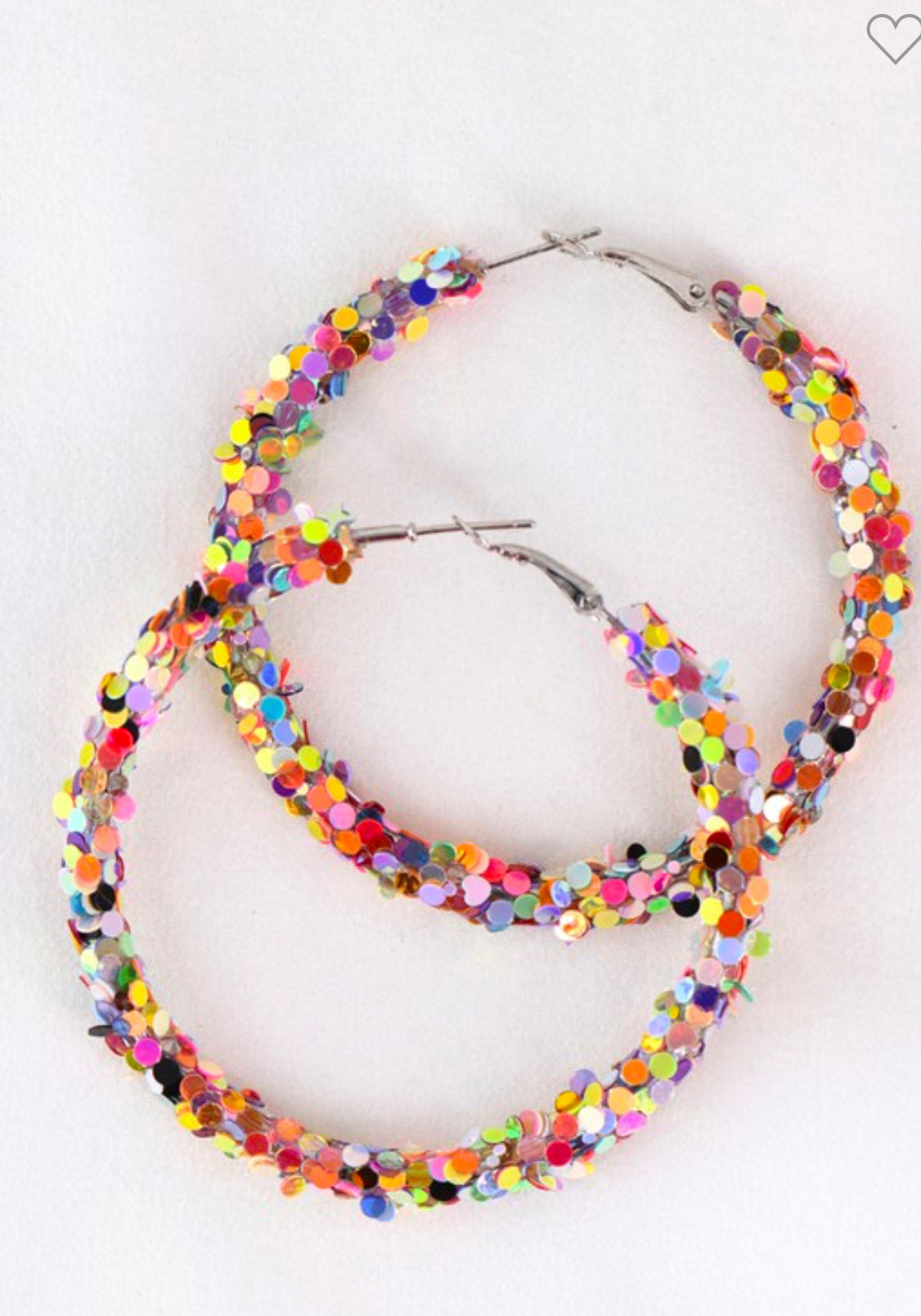 Add some sparkle to your everyday look with our Confetti earrings! These hoop earrings feature vibrant multicolor sequins that catch the light and add a touch of fun to any outfit. Perfect for anyone looking to add a pop of color and a bit of extra shine to their style.