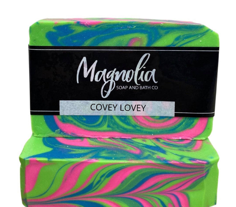 Our Covey Lovey is like a bouquet of roses in your shower! This handcrafted soap has a unique scent of magnolia, lemongrass, citrus, and rose--perfect for the flower-lover who wants a fresh and happy shower experience. Get ready for your daily dose of Covey Lovey!