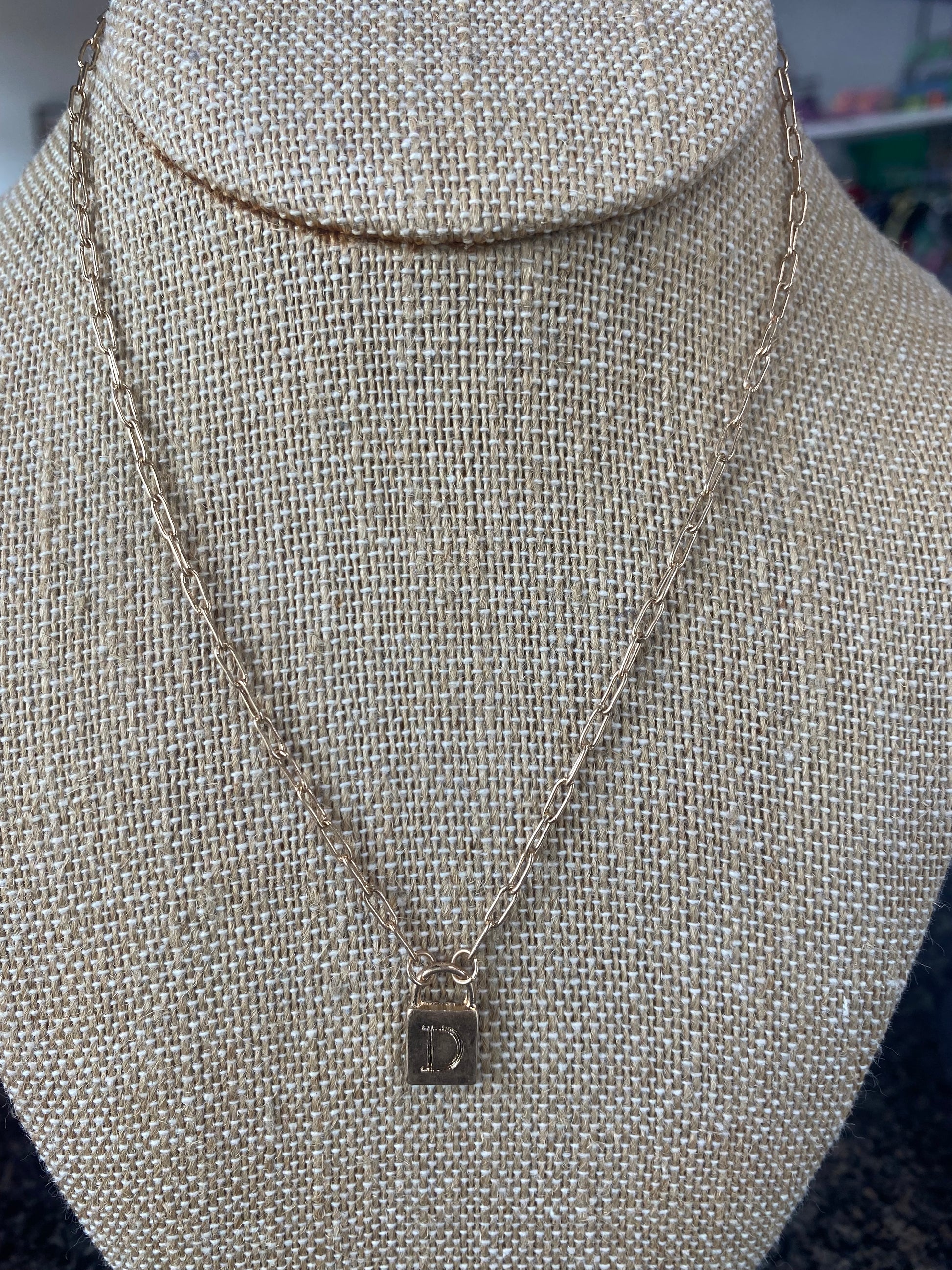 short necklace with initial engraved on lock