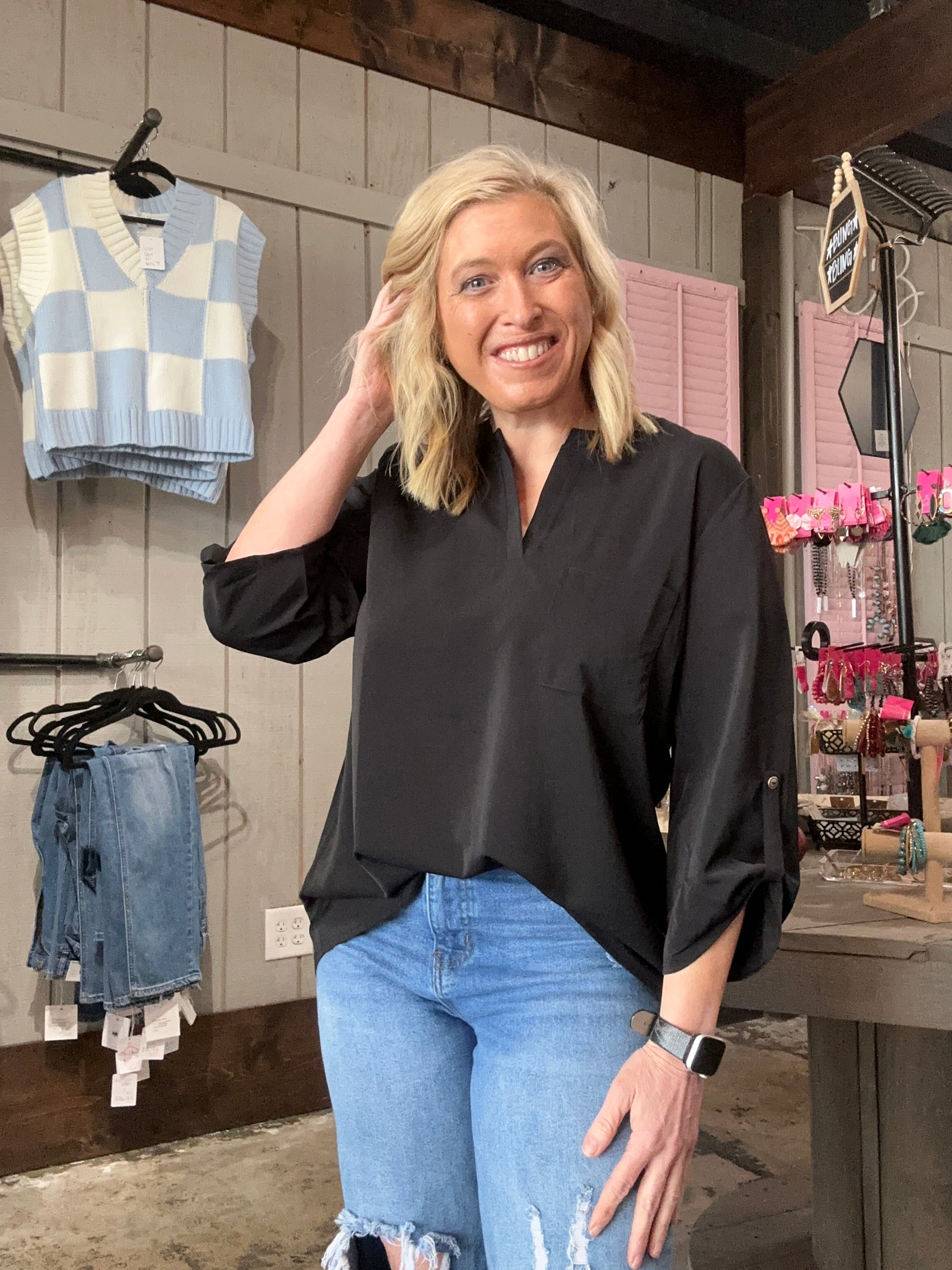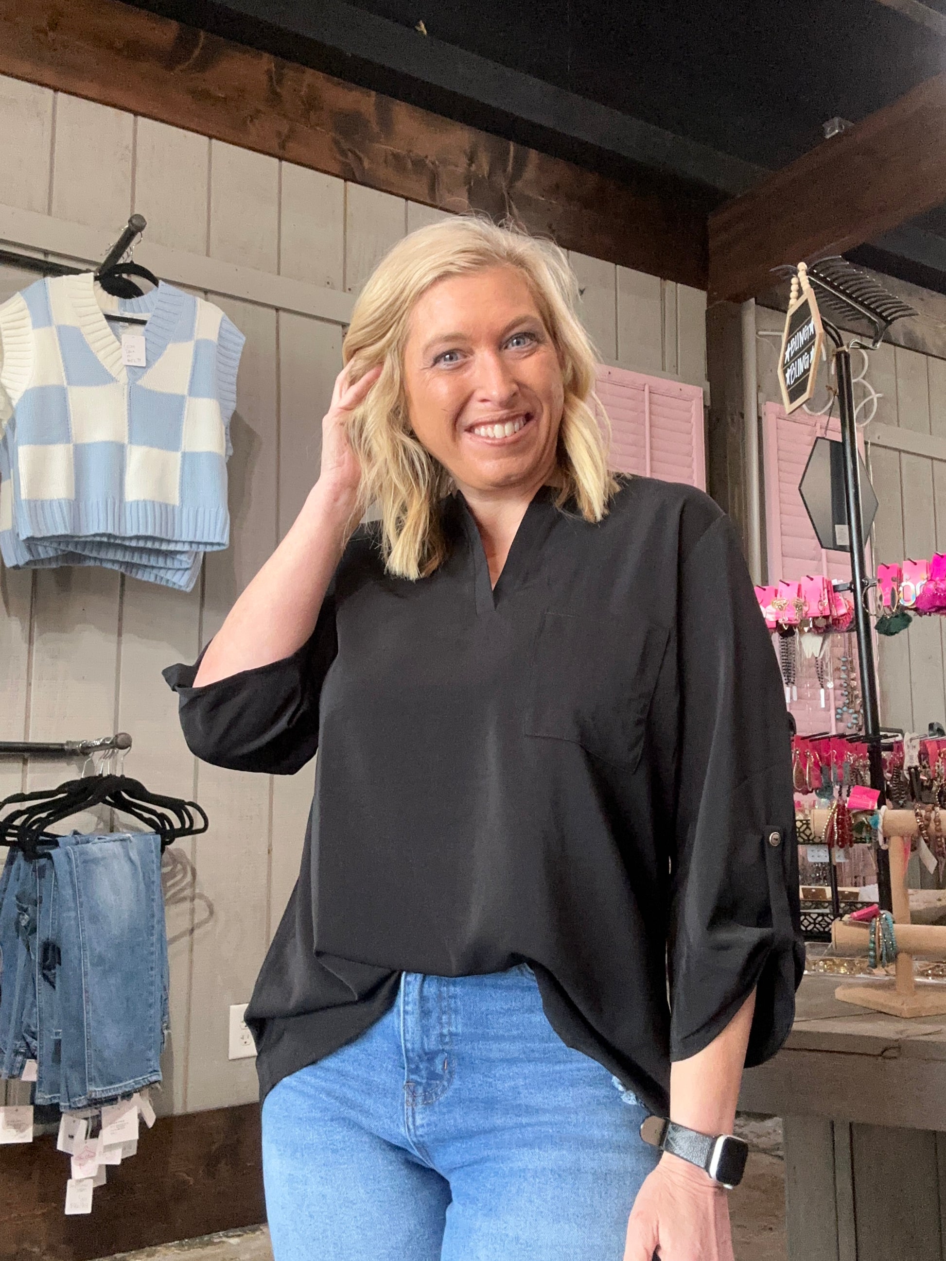 Introducing Dana - the perfect top for any occasion! Made from 100% polyester, the 3/4 sleeves and front pocket detail add a touch of elegance while the side slit flatters all body types. Comfortable, stylish, and versatile, Dana is a must-have in every wardrobe.