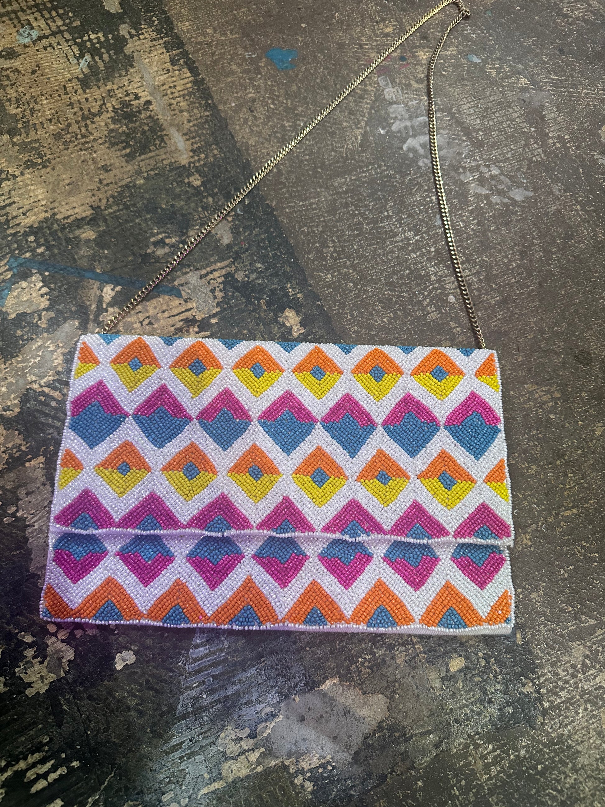 Introducing Febbie, the Seadbead colorful clutch purse with a convenient chain strap! Keep your essentials close and add a pop of color to any outfit. Perfect for a night out or everyday use. Go ahead, be bold with Febbie!