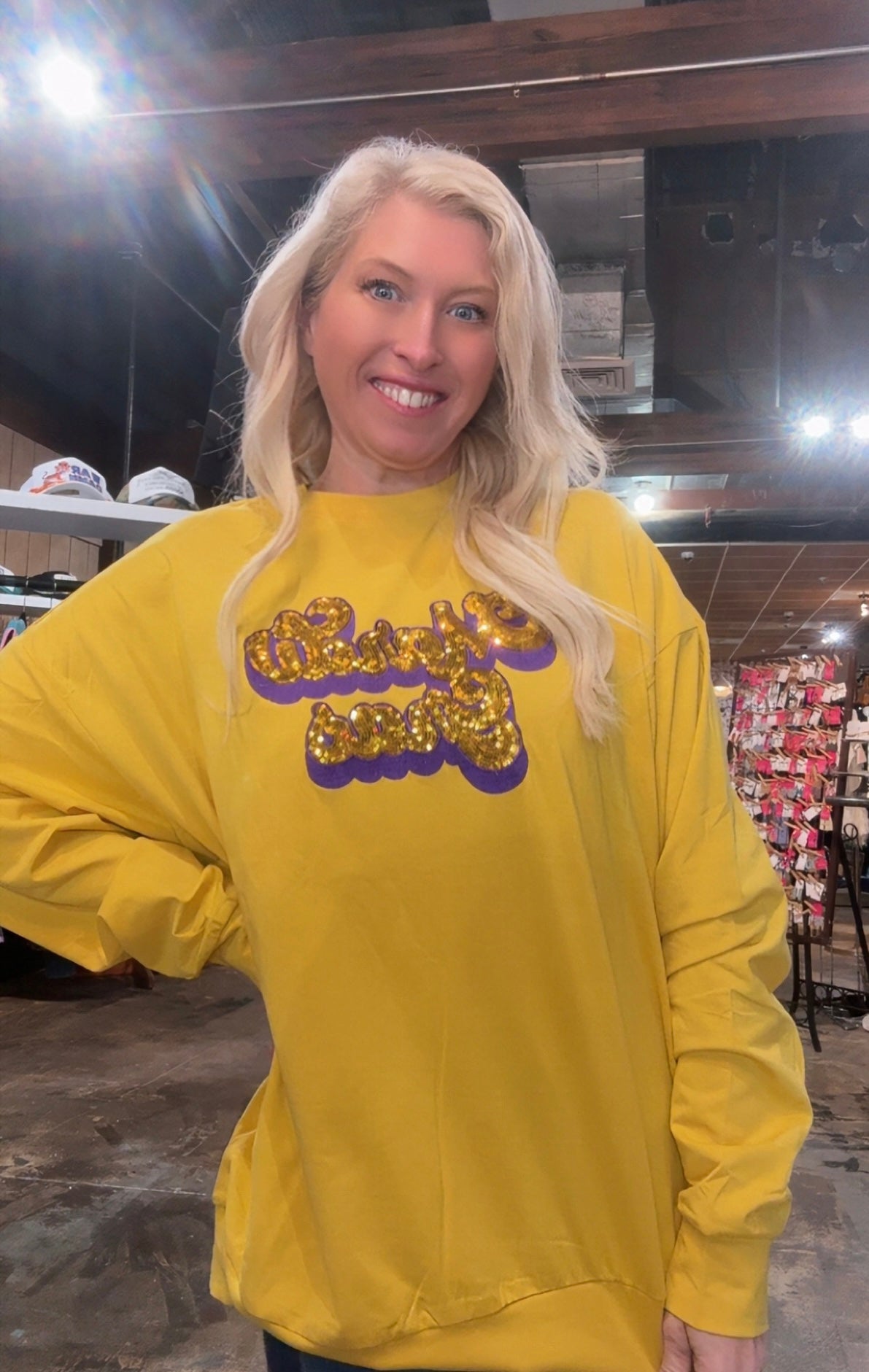 Elevate your style with the Gras Mardi Gras sequin embroidery long sleeve top. Crafted from a comfortable blend of 60% polyester, 35% cotton, and 5% spandex, this vibrant piece combines flair with flexibility. The dazzling sequins will make you the star of any celebration—let your spirit shine!