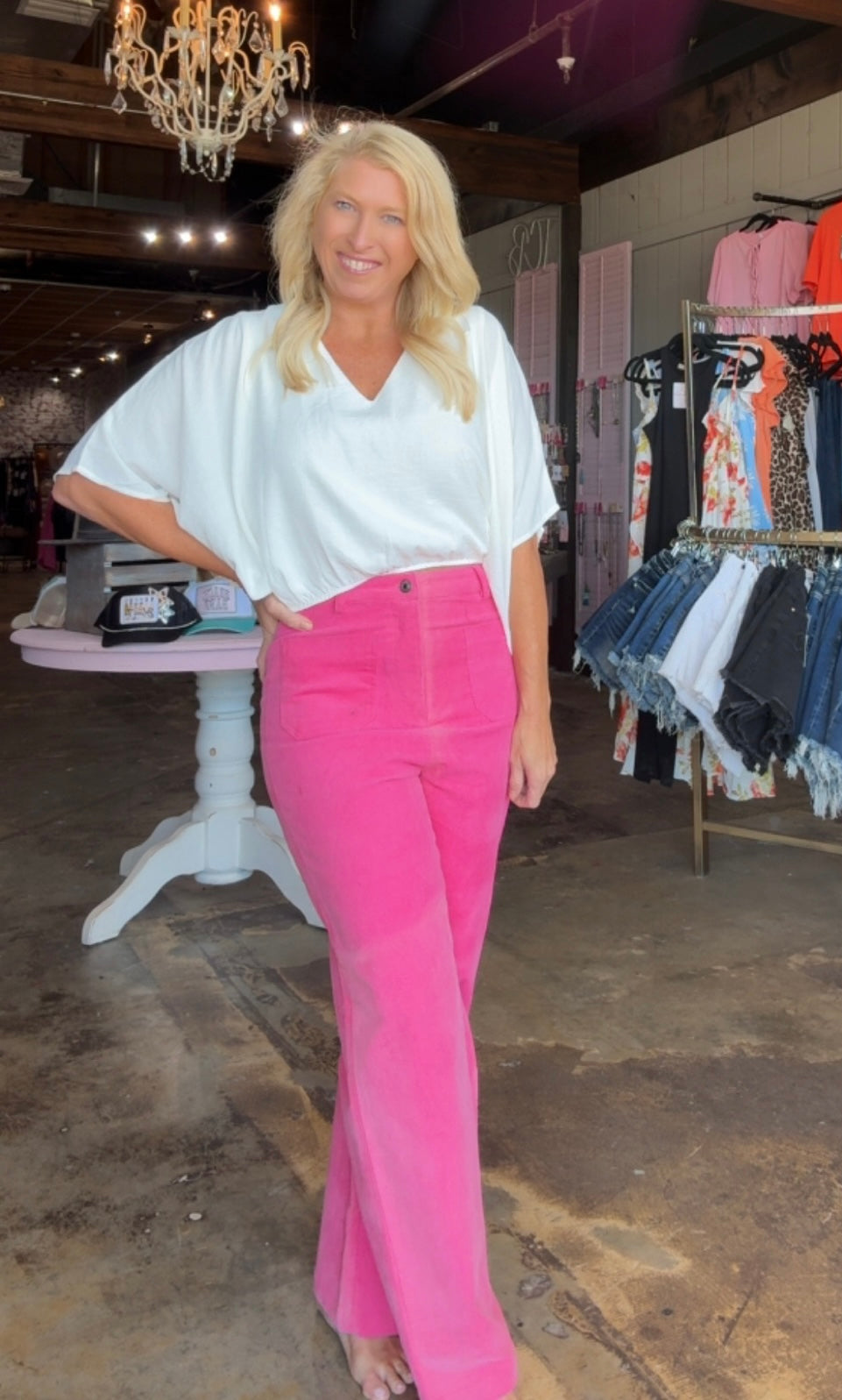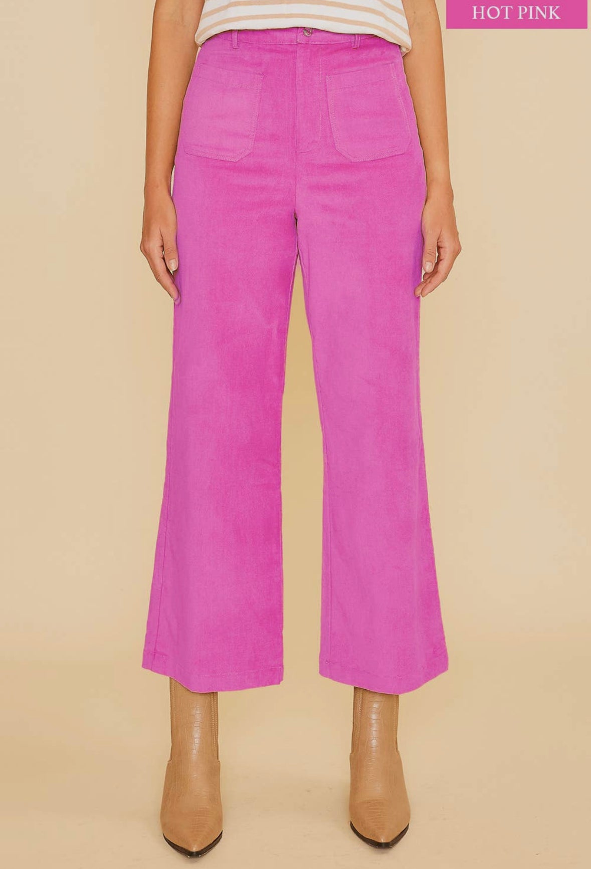 Gwen is here to elevate your style! Look fierce and feel fabulous with these lush pink pants, crafted from a suede feel Chorduroy fabric. Step out in confidence in the wide legs which will heighten your glamorous look, making heads turn! Stop and strut your stuff!