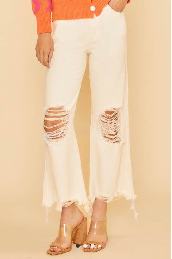 Say hello to allure in the chicest way with these 'Hello Gorgeous' wide leg cropped jeans - distressed to perfection! Flaunt the unique style of denim goddess with this edgy addition to your wardrobe. Fabulous with a sleek blouse or half-tucked tee. 🔥