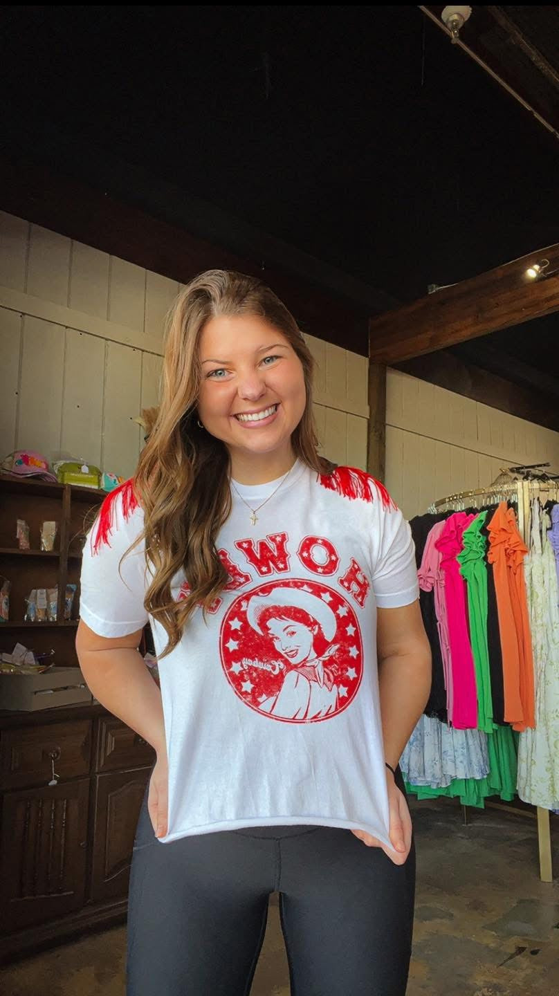 Yeeee-haw! Get ready to wrangle in style with the Howdy Cowboy top! Featuring a playful Howdy graphic and eye-catching red fringe, this top is sure to make you stand out from the herd. So saddle up and show off your unique western flair!