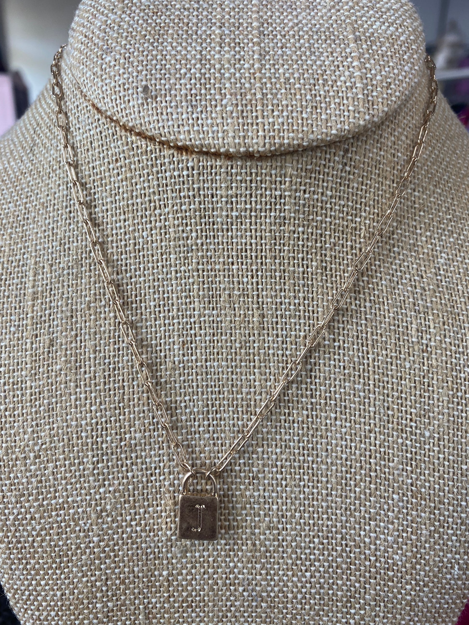 short necklace with initial engraved on lock