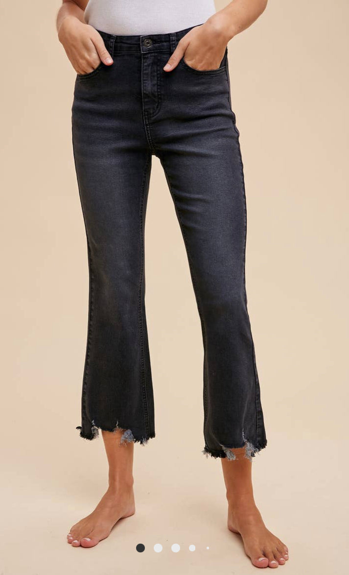 Introducing Jana, the must-have high-rise faded black flare denim. Enjoy all-day comfort and style with a hint of destructed detail and the perfect stretch. Get ready to make a statement!