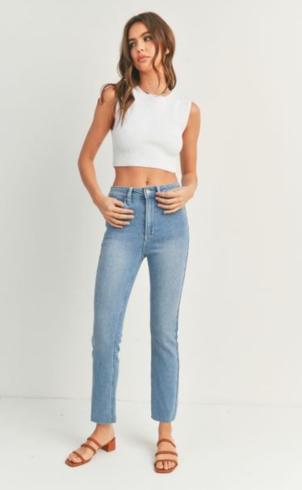 Introducing Joni, the skinny jeans that offer a trendy, casual vibe with its scissor cut raw hem and light wash denim. These jeans sit at your true waist and are cropped above the ankle, perfect for showing off your favorite shoes. Made with 93% cotton, 5% polyester, and 1% spandex for a comfortable fit.