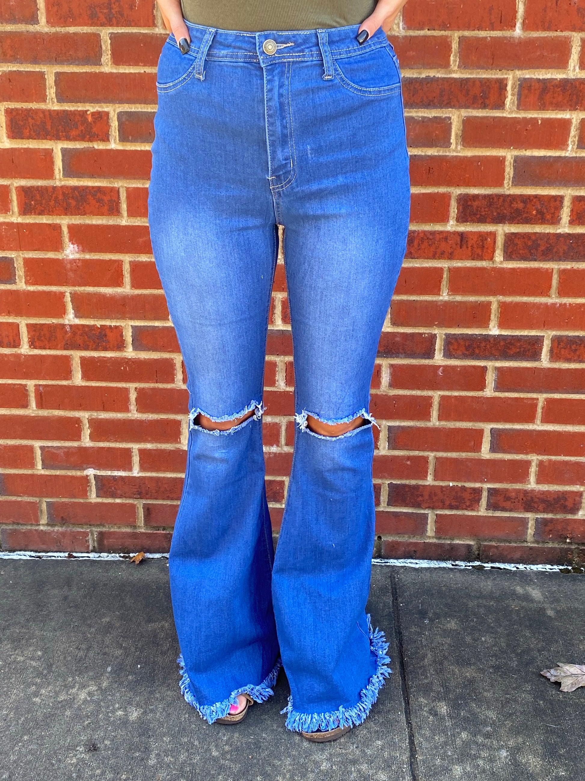 Look stunning in the Karlie bell bottoms from JCJQ! The high waisted silhouette, medium wash, and rip and tear hem will give you a fashionable edge that's sure to make your look stand out. Showcase your style with Karlie!