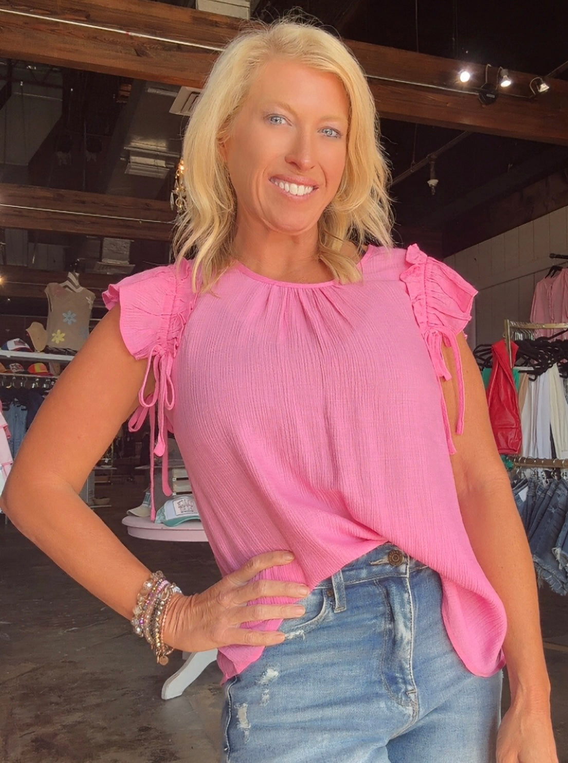 Introducing Katie, the top that's ready to ruffle some feathers. Made of 80% rayon and 20% nylon, this top features a playful drawstring and ruffled detailing. Perfect for adding some fun and flair to your wardrobe.