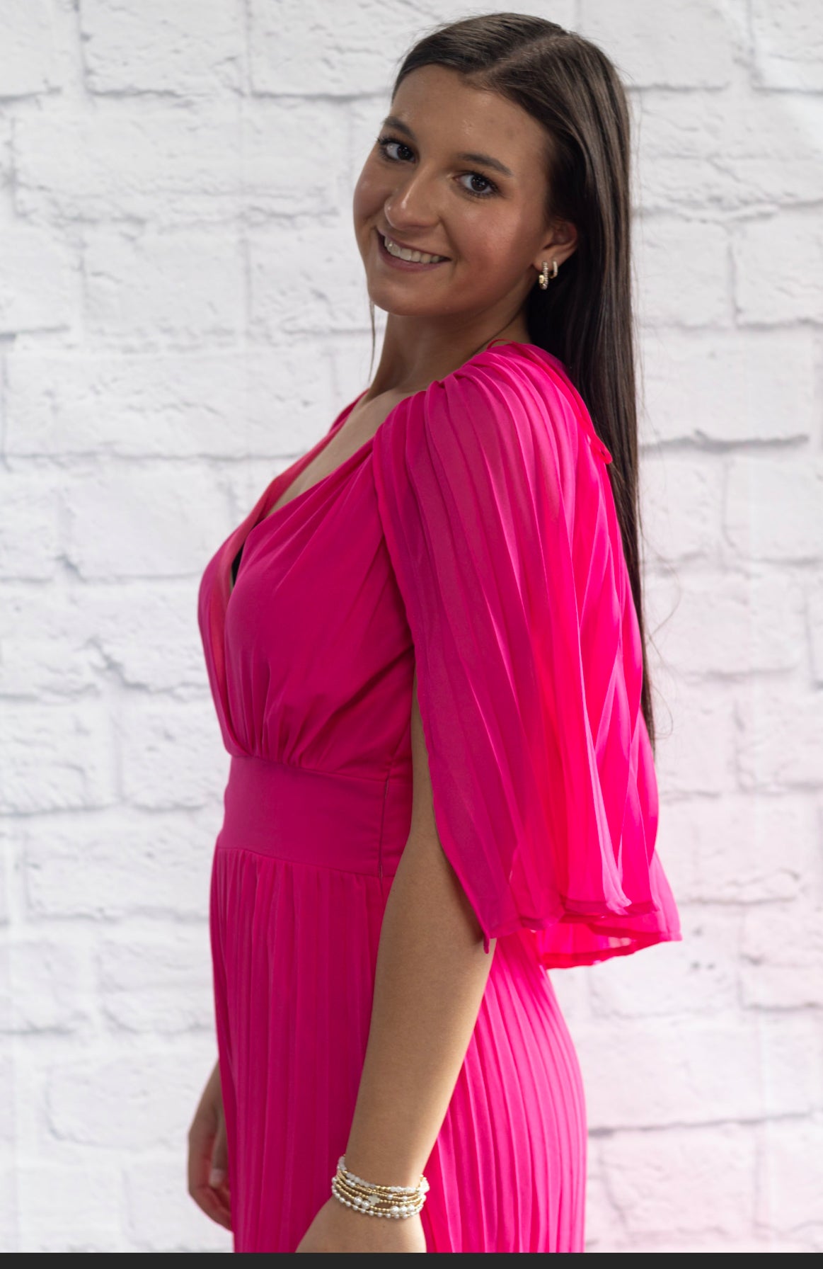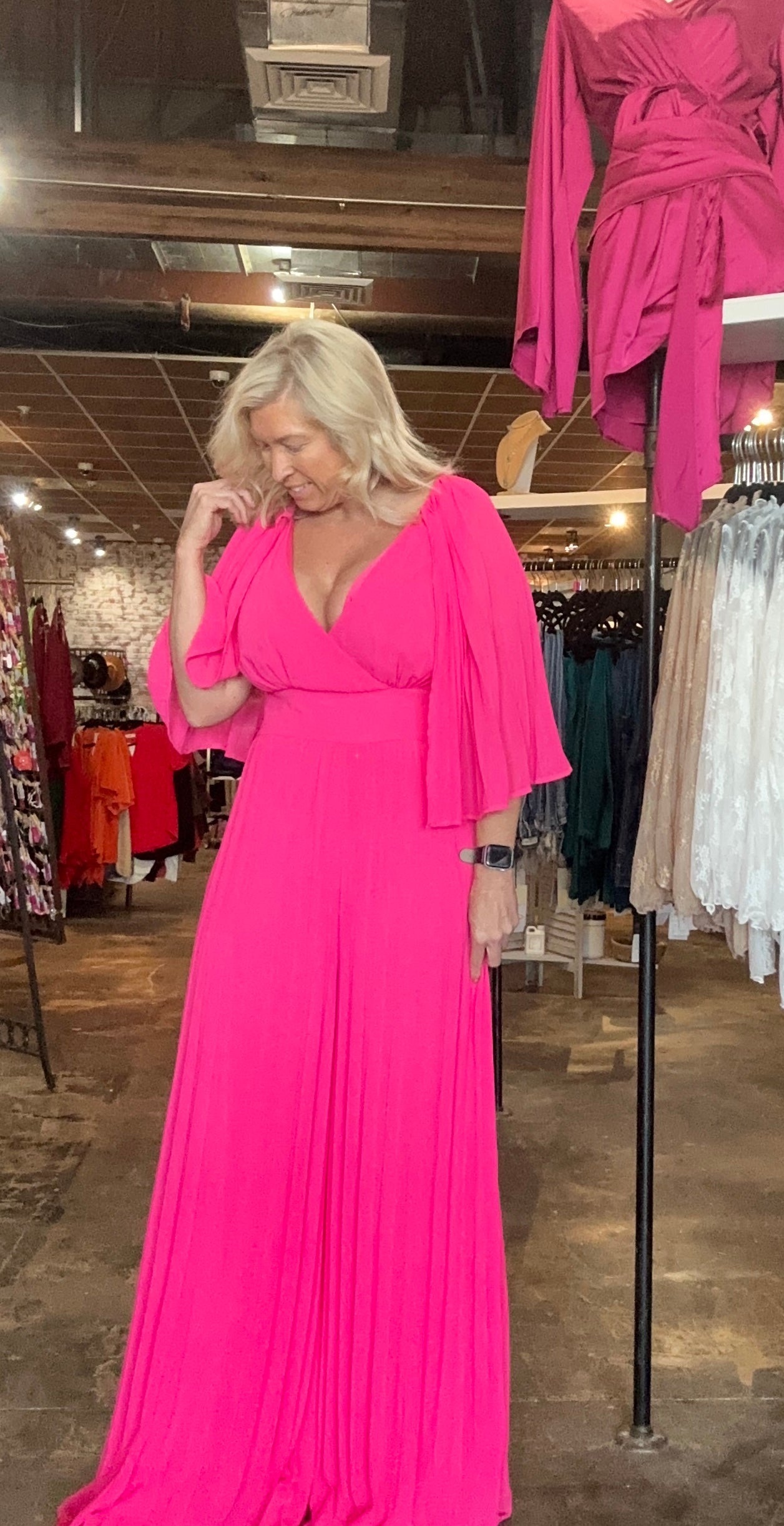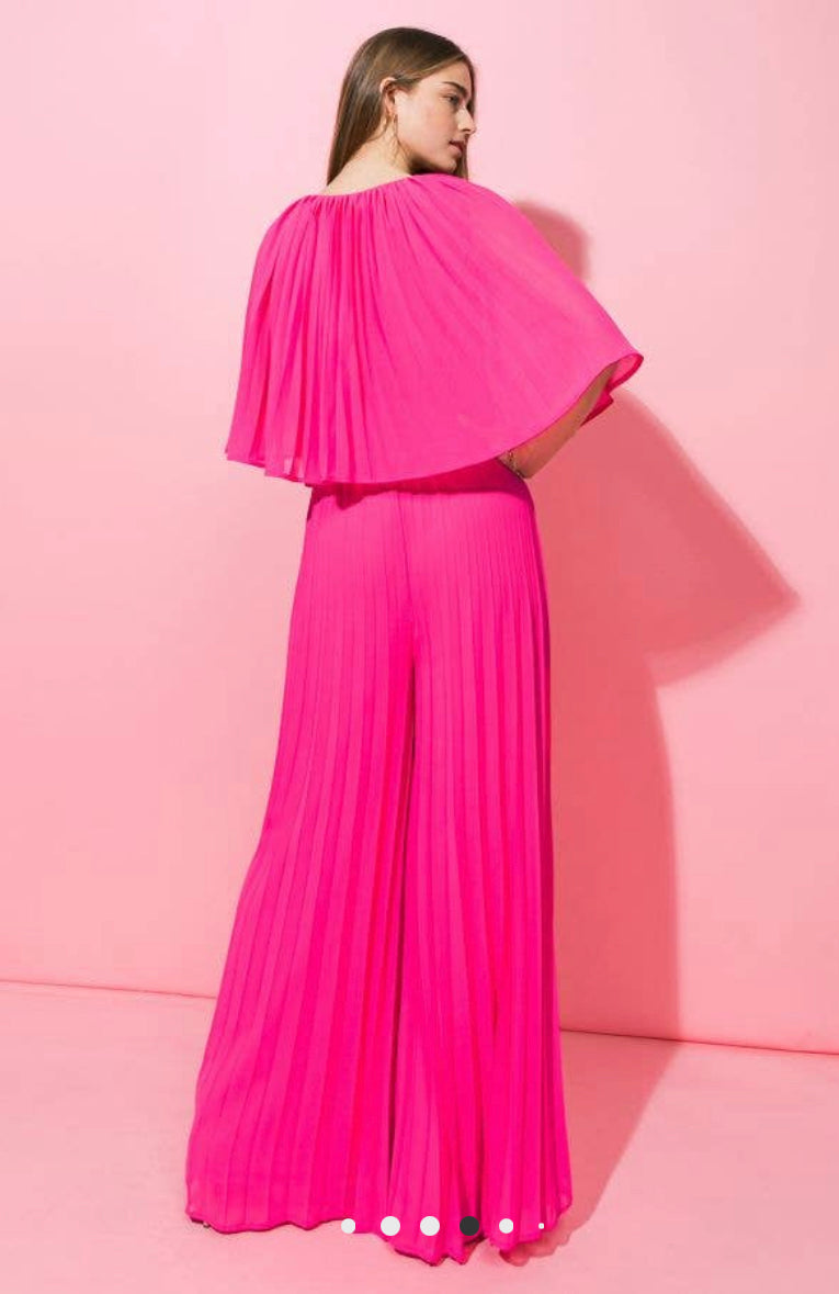 Sleek and sophisticated, Katie is the jumpsuit for the modern fashionista. The solid woven jumpsuit features a surplice neckline, capelet shoulder, a wide waistband and pleated wide legs, perfect for a night out on the town! Show off your style and be ready to turn heads!