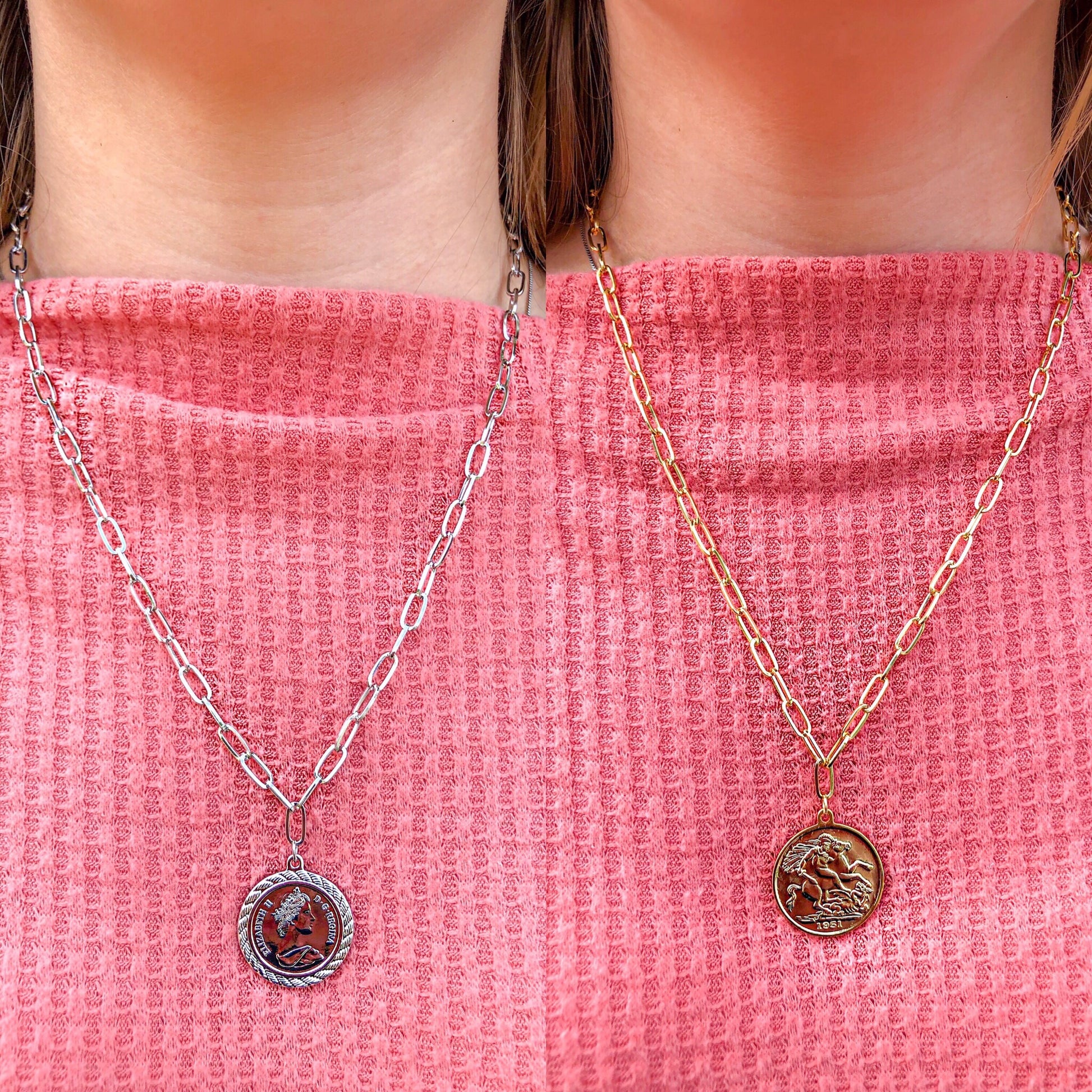 This bold coin necklace is sure to be a staple! Snag it and wear it with almost anything in your closet!