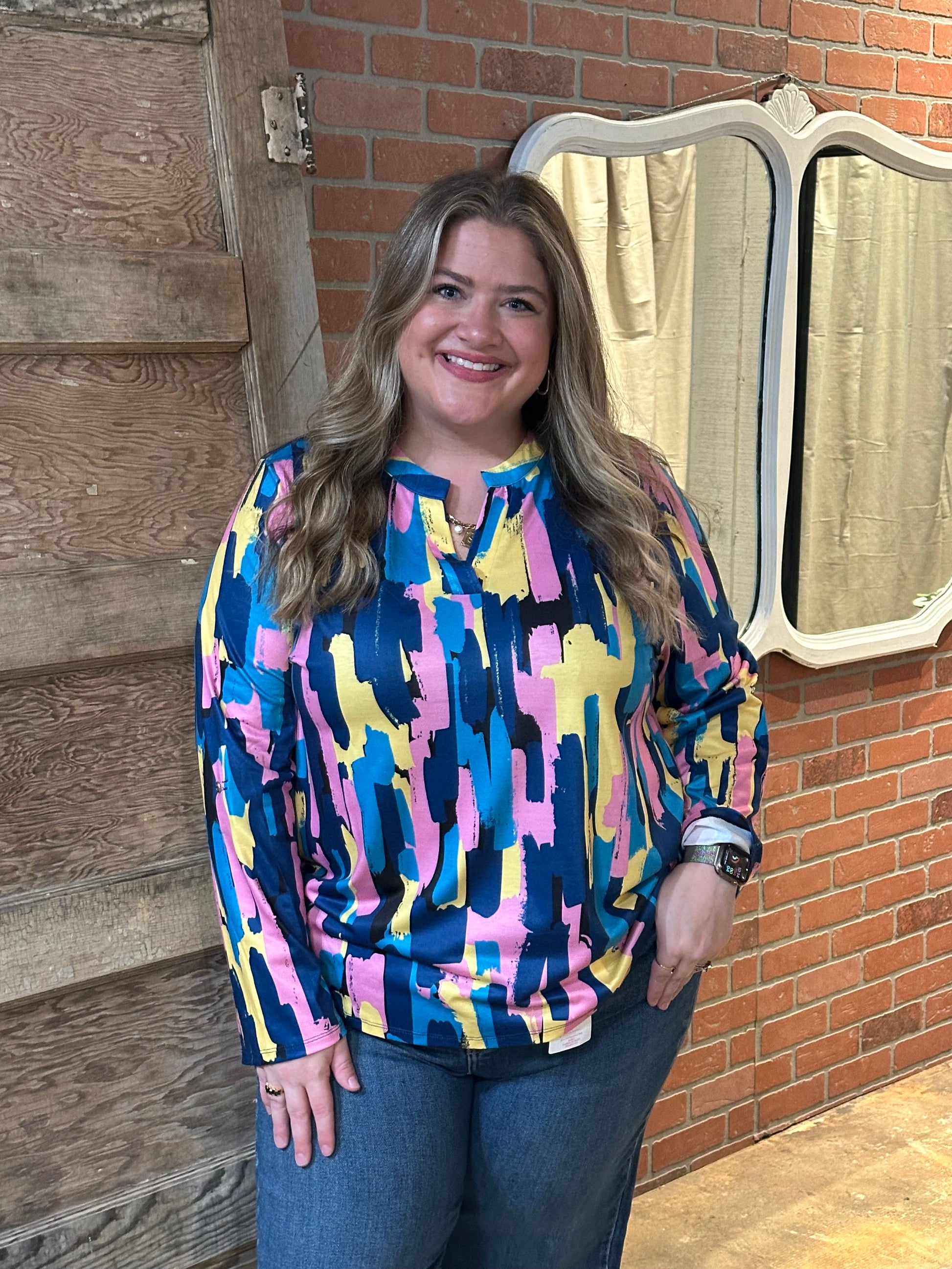 Introducing Lacey, the perfect addition to your wardrobe! This brush stroke 3/4 sleeve top will elevate any outfit with its unique design and versatility. Express your artistic side while staying comfortable and stylish. Upgrade your look with Lacey today!