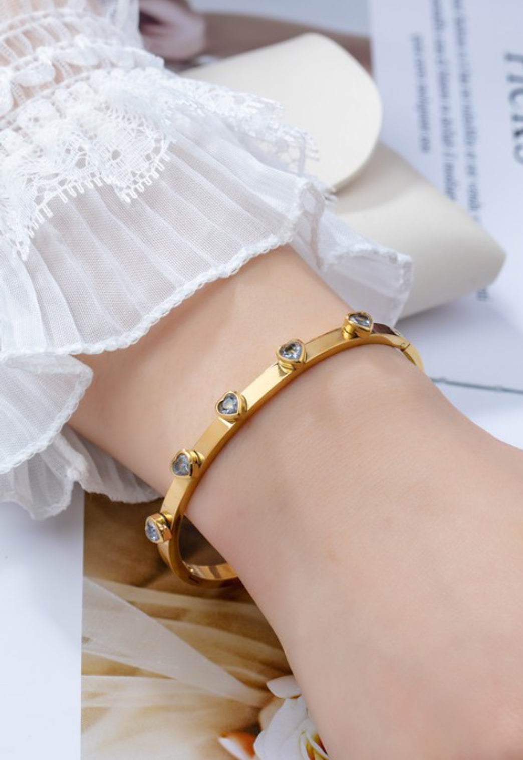This stunning bangle is made of waterproof stainless steel and features a beautiful gem heart hinge. It is a timeless piece that adds elegance to any outfit. Perfect for any occasion, it is also durable and long-lasting. A must-have accessory for those who appreciate quality and style.