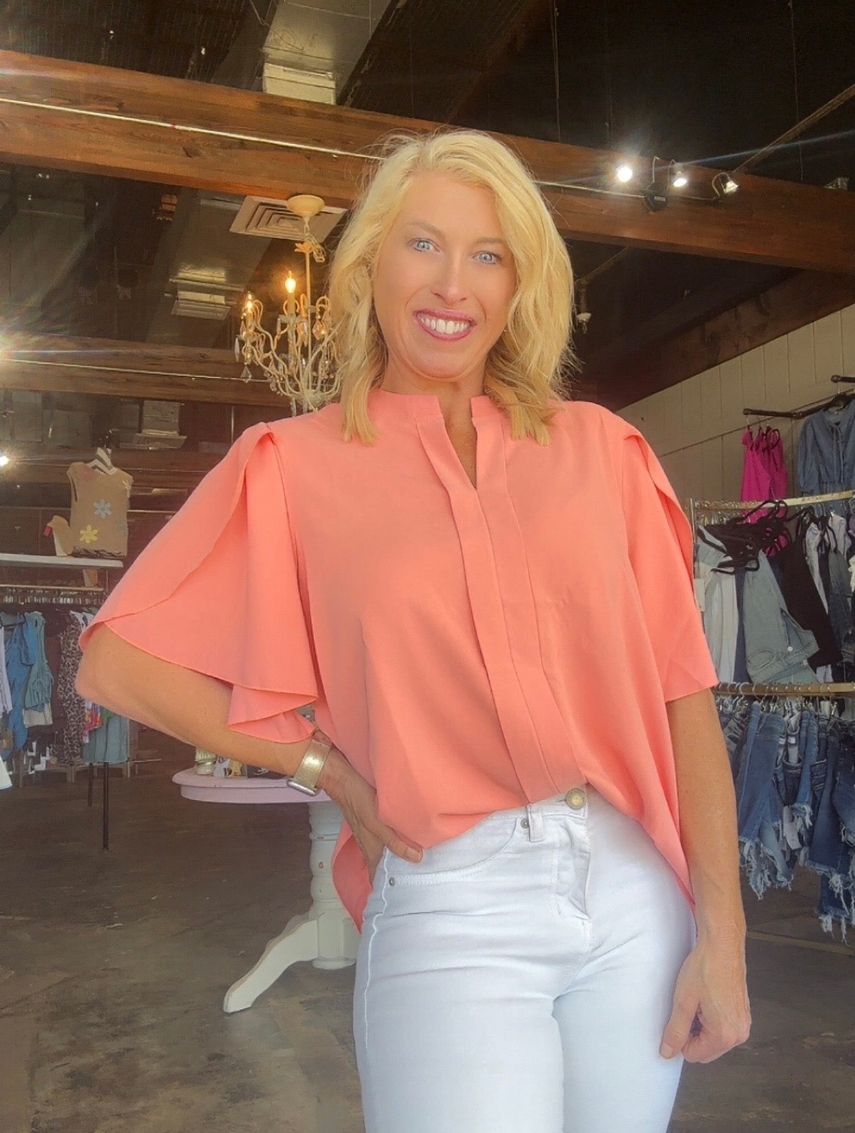 Introducing Luna - a stylish and comfortable blouse that will elevate your everyday look! Crafted with 100% polyester, its lightweight and loose fit is perfect for any occasion. The petal flutter sleeves add a touch of playfulness to the classic woven design. Look and feel your best with Luna!