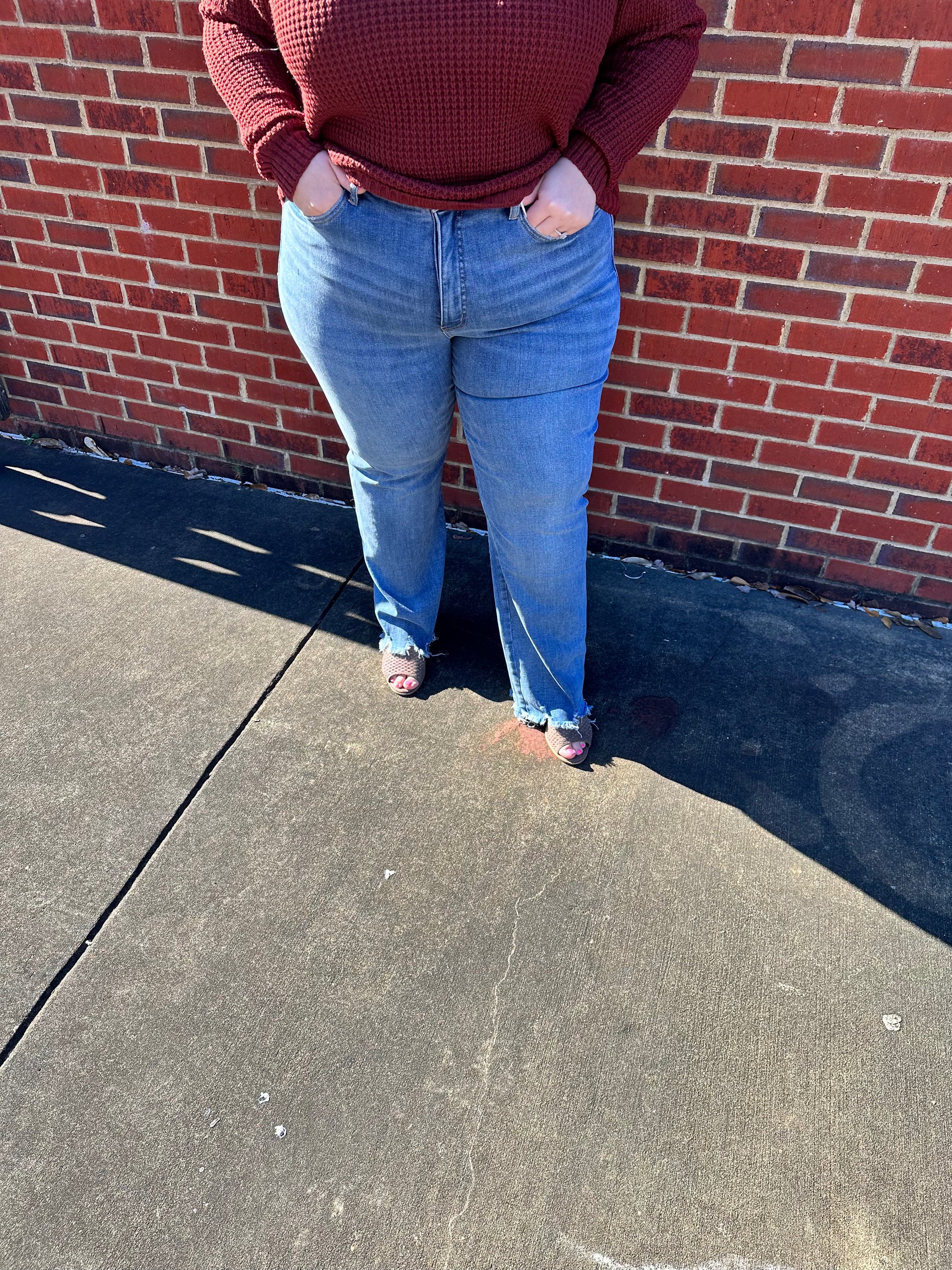 Elevate your style with Maddie, our super high rise Vervet jeans. The raw hem and loose fit provide a comfortable and trendy look, perfect for any occasion. Turn heads and feel confident in these must-have jeans.