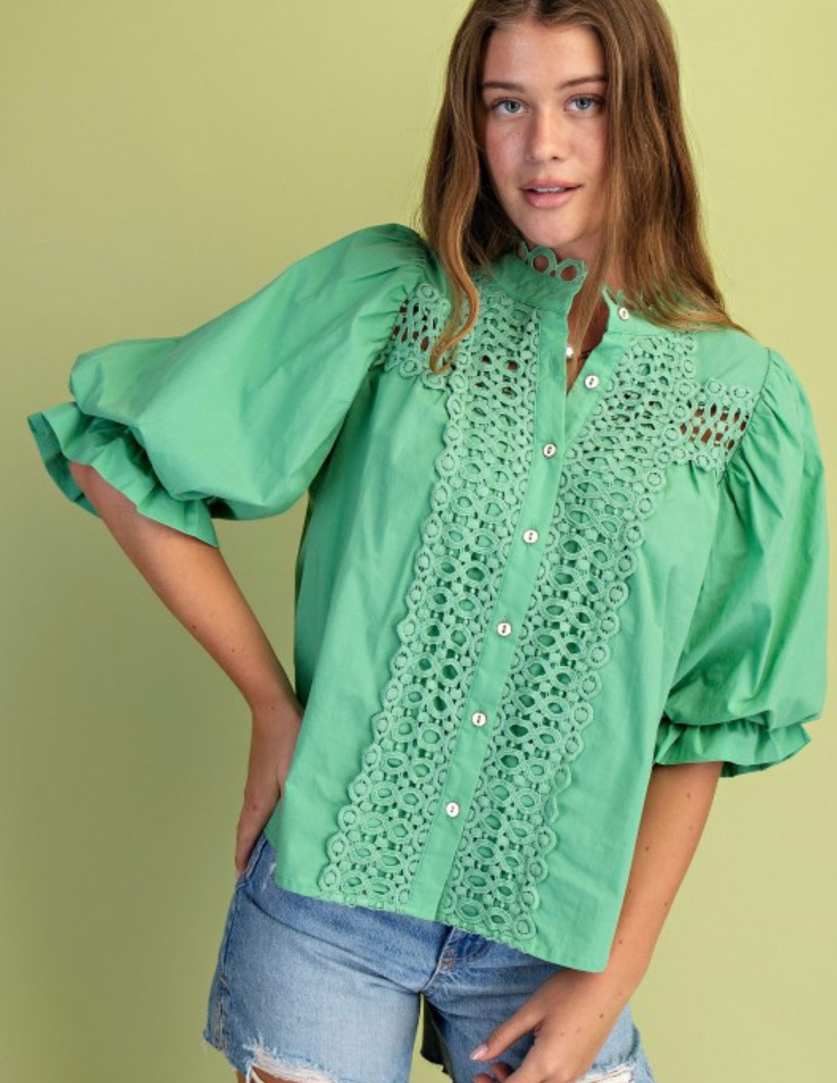 Elevate your wardrobe with the Maggie blouse! Crafted from 100% cotton, this button-down top features exquisite trim details and elegant 3/4 length gathered balloon sleeves. Experience comfort and style that effortlessly transitions from day to night. Feel confident and chic in every moment!