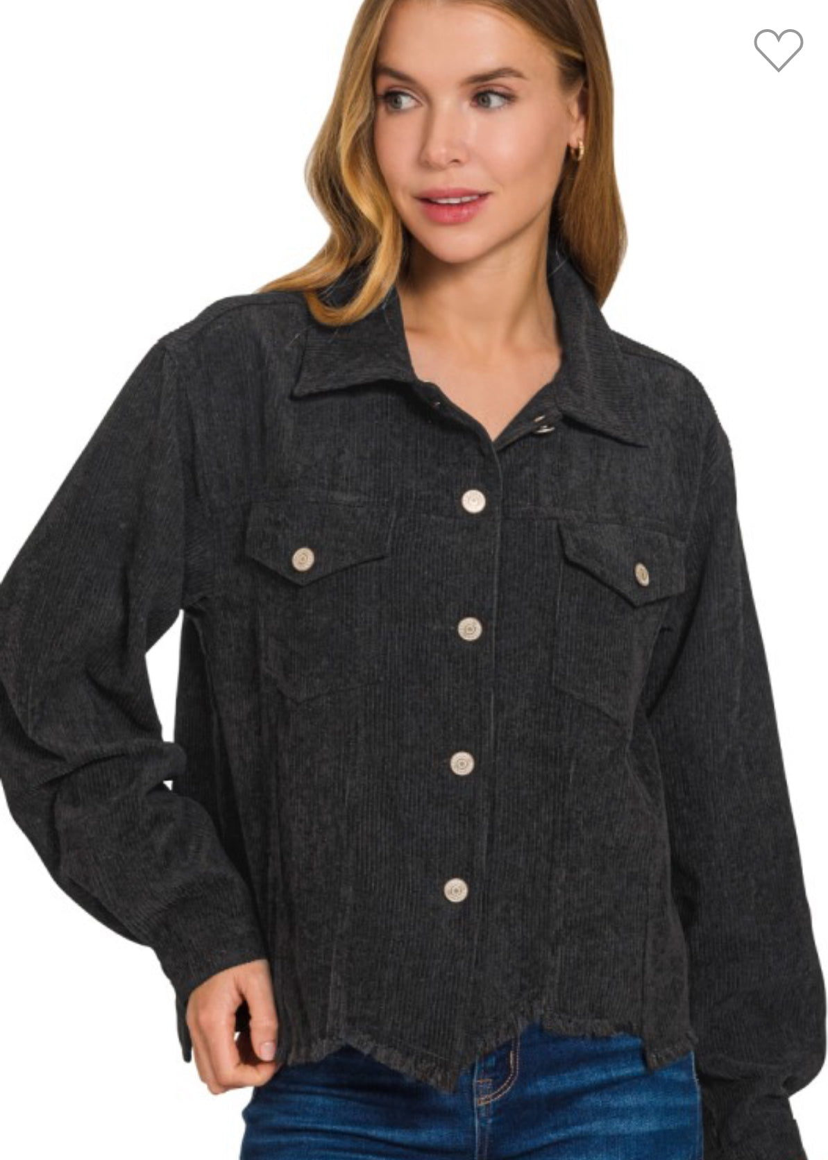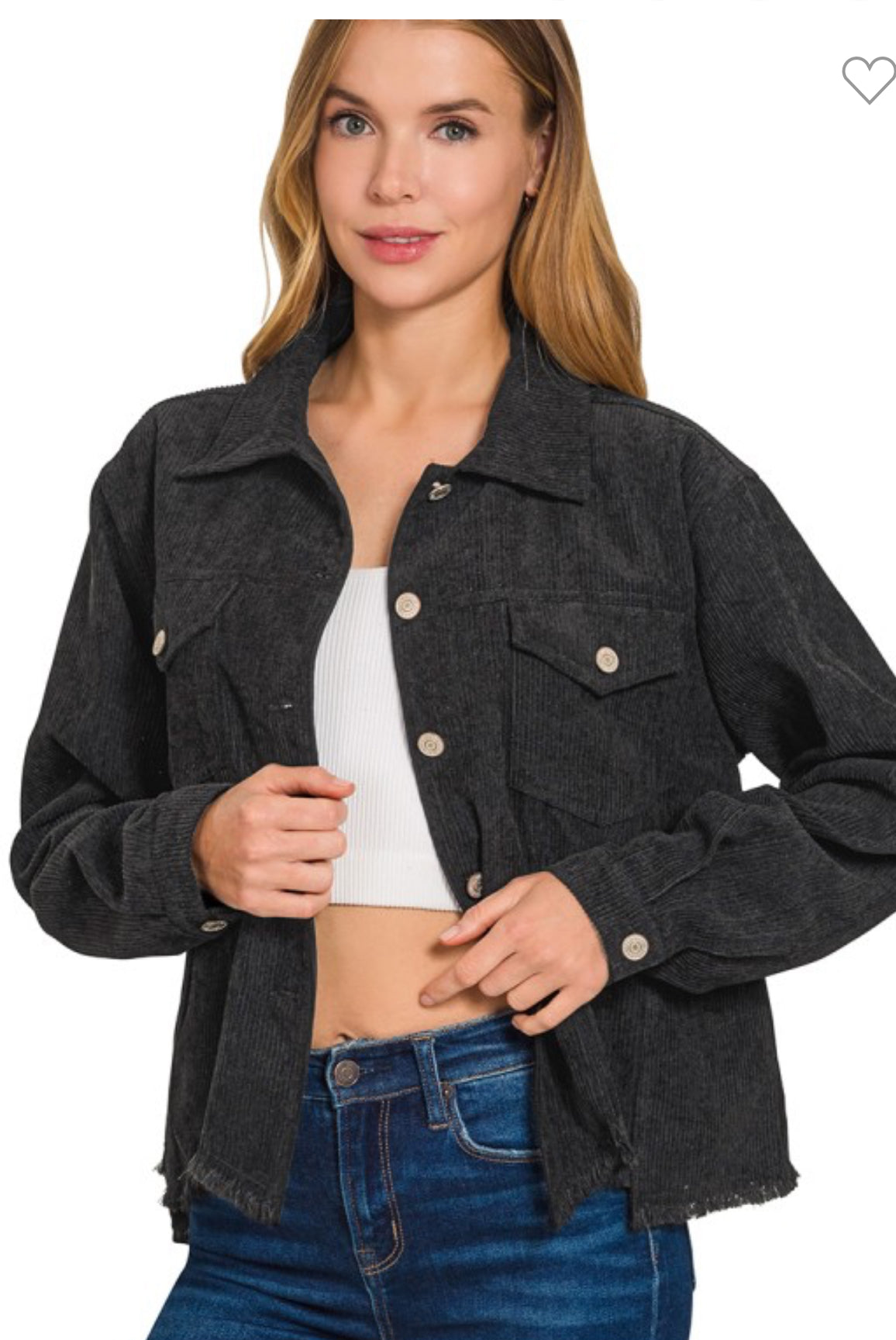 Unleash your edgy side with Midnight Mercy, a distressed corduroy frayed hem cropped jacket. Embrace the versatility of this unique piece, perfect for adding a touch of boldness to any outfit. Elevate your style and make a statement with Midnight Mercy.