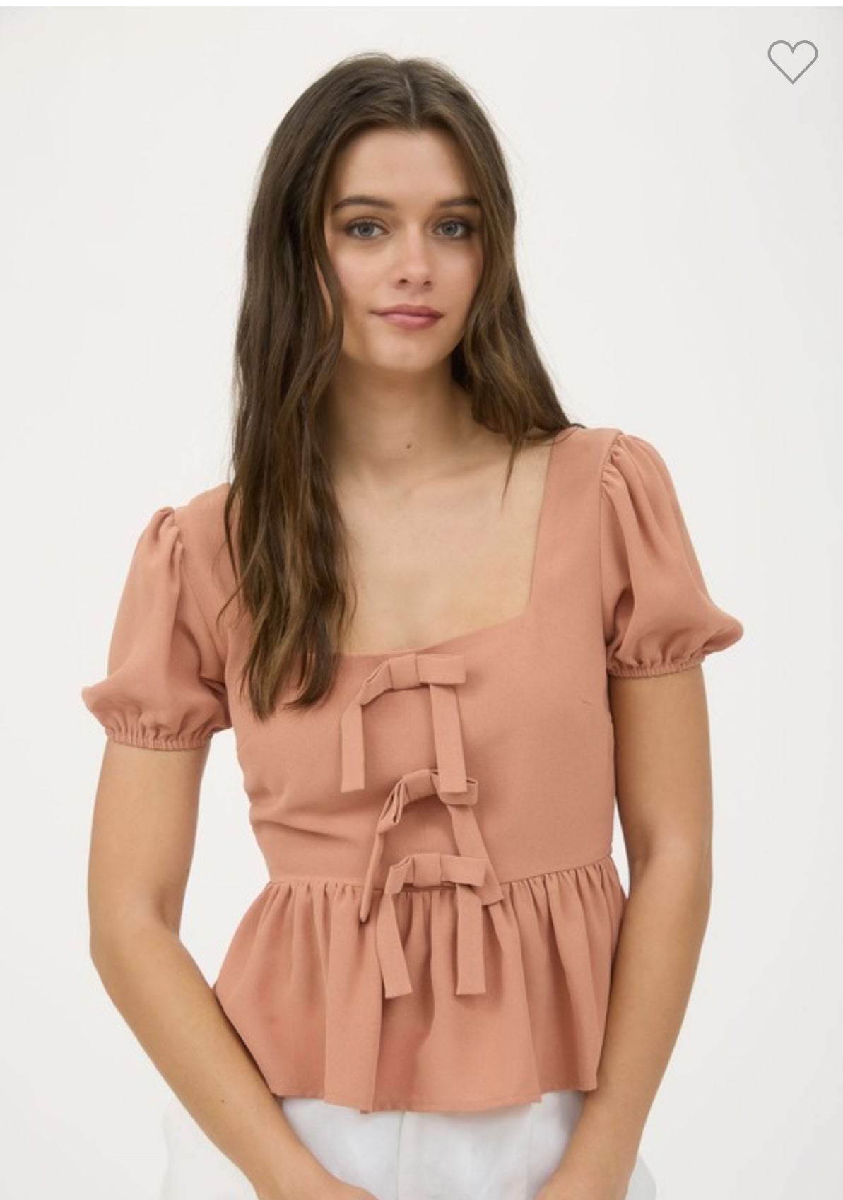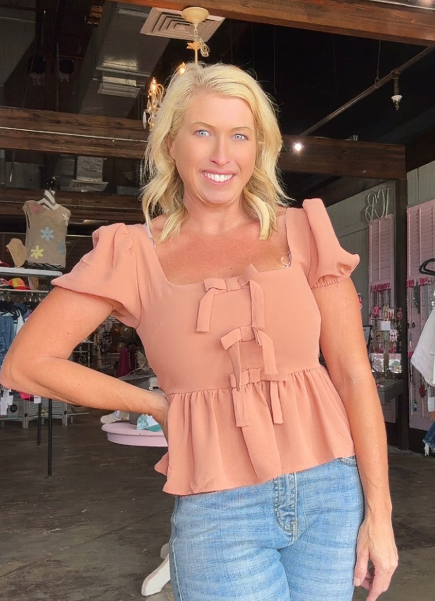 Meet Rachel - the must-have peplum top with bow detail and puff sleeves! Made from 100% polyester, its unique design adds a touch of charm and sophistication to any outfit. Elevate your style game and feel confident and stylish in Rachel.