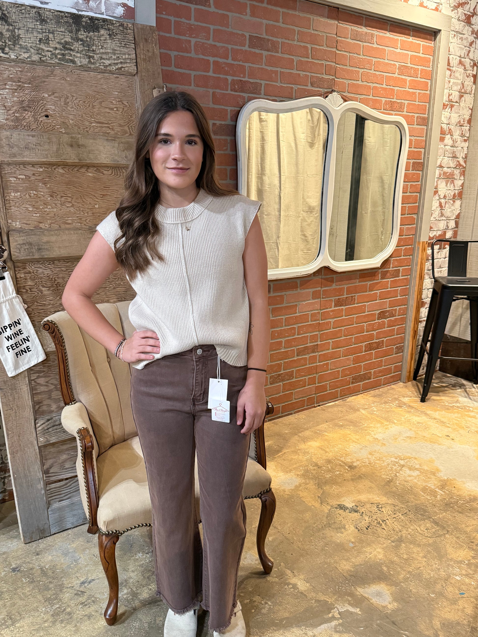 Elevate your wardrobe with Rachel, the ultimate versatile piece. This sleeveless crewneck sweater knit top is crafted from a blend of 60% cotton and 40% acrylic, providing both comfort and style. Dress it up or down for any occasion.