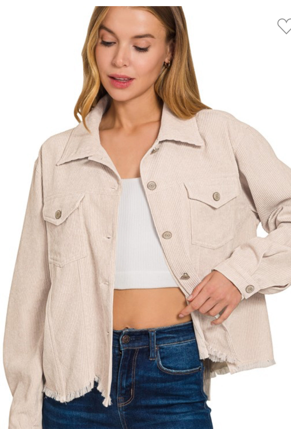 Get ready to elevate your fashion game with Raina! This distressed corduroy cropped jacket features a frayed hem, adding a touch of edginess to any look. Perfect for a cool and casual vibe, Raina will have you turning heads and feeling confident.