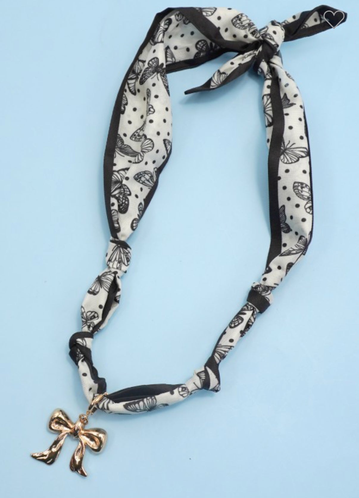 Introducing Sarah, the perfect butterfly print scarf necklace! Show off your fashion sense with this versatile accessory, complete with a beautiful gold bow charm that can be removed for a customizable look. Add a touch of elegance to your outfit and elevate your style game.