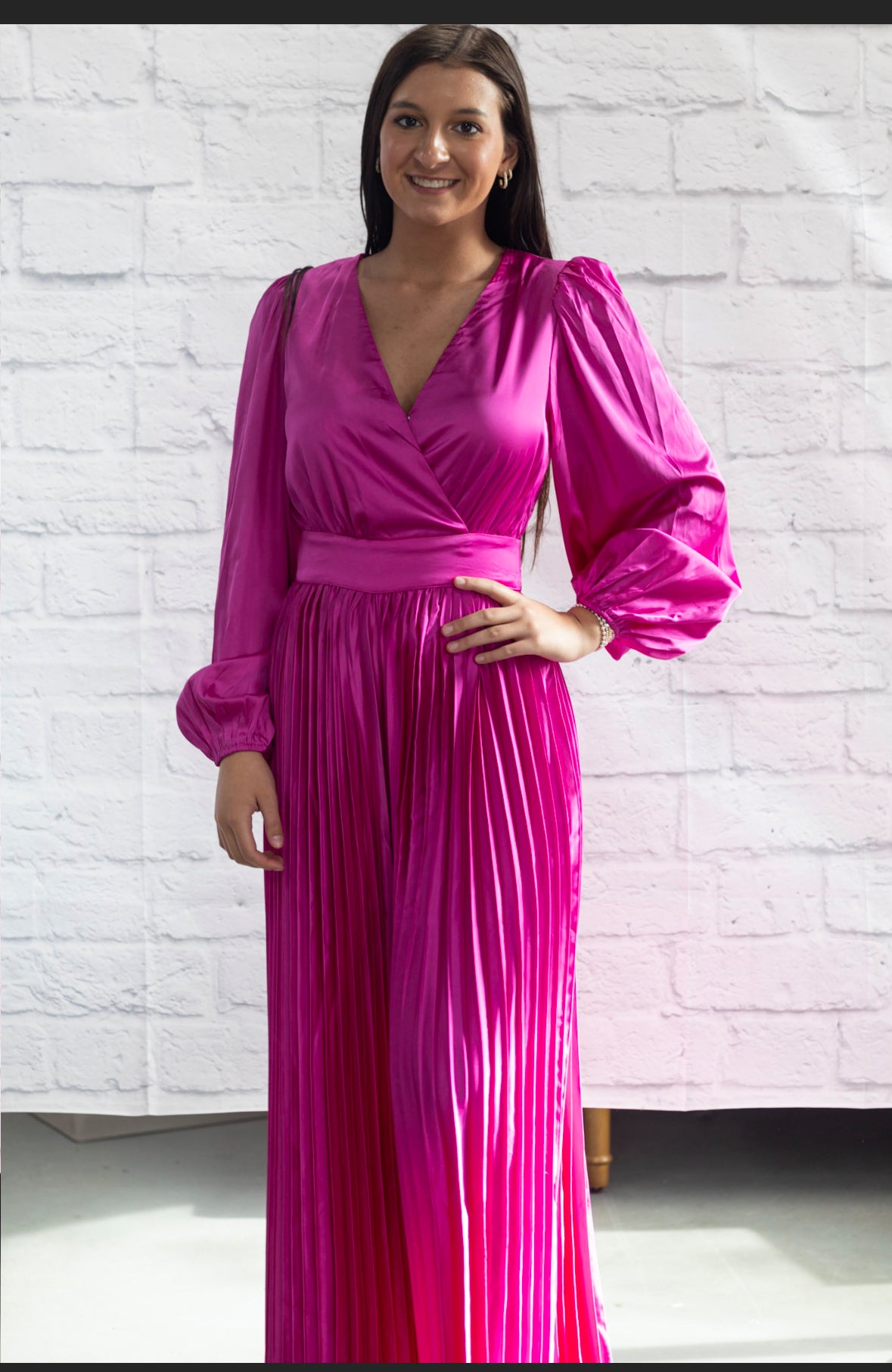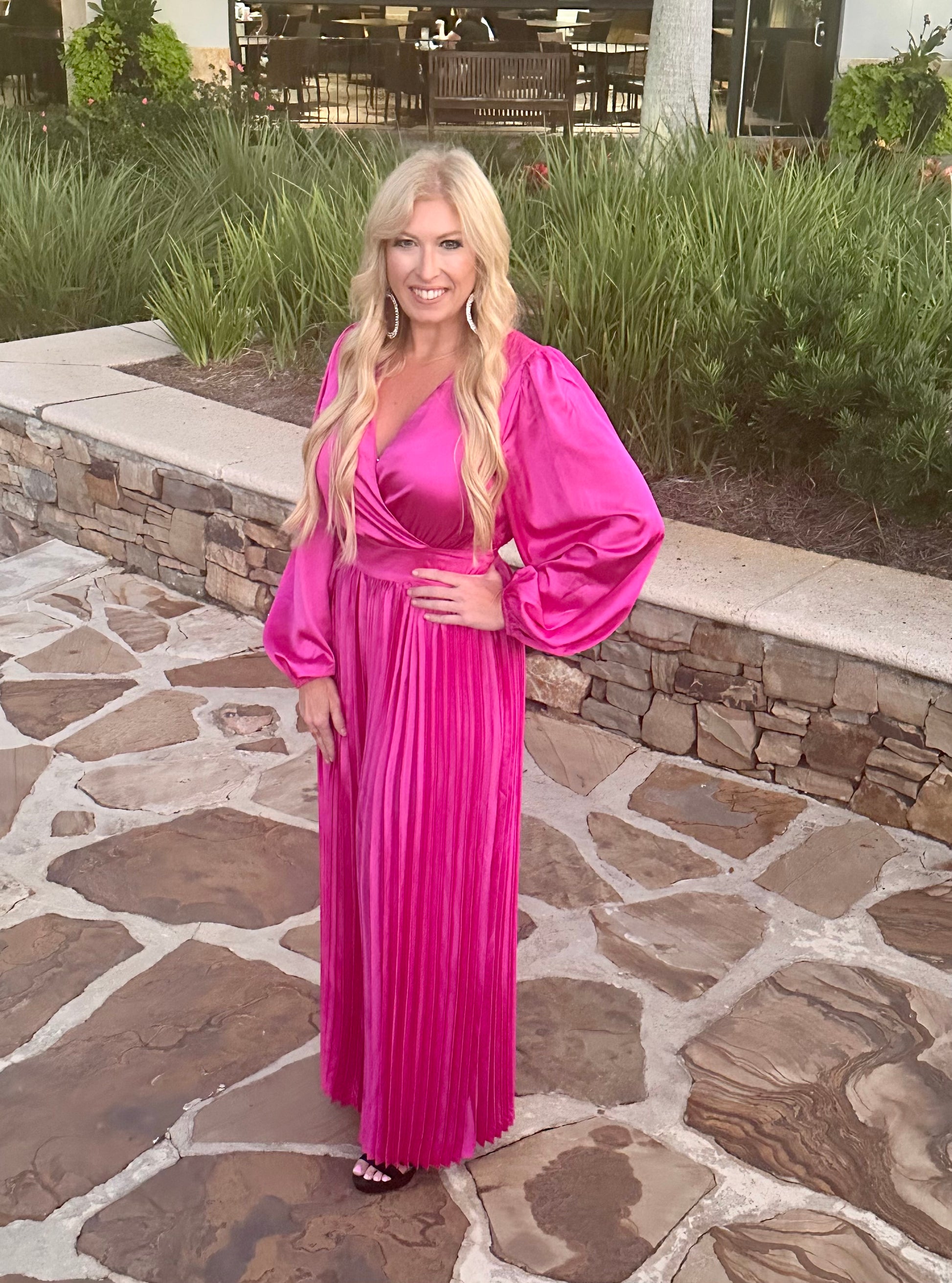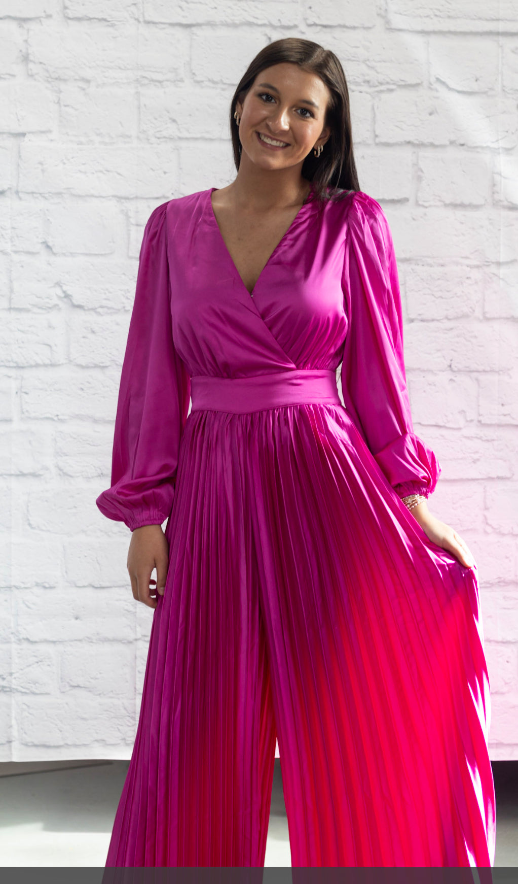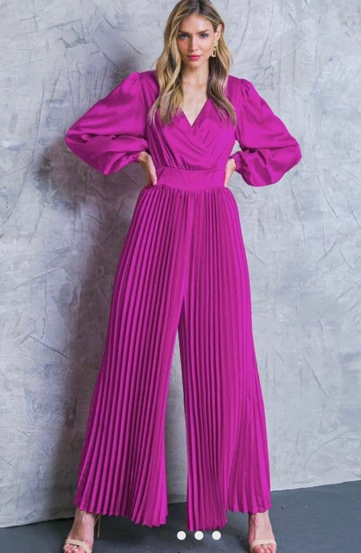 Stand out at your next special occasion in this sassy fuchsia jumpsuit! Crafted from satin, this one-piece boasts a surplice neckline and pleated wide-leg pants for a look that is sure to turn heads. Make an entrance with this stylish and comfy piece!