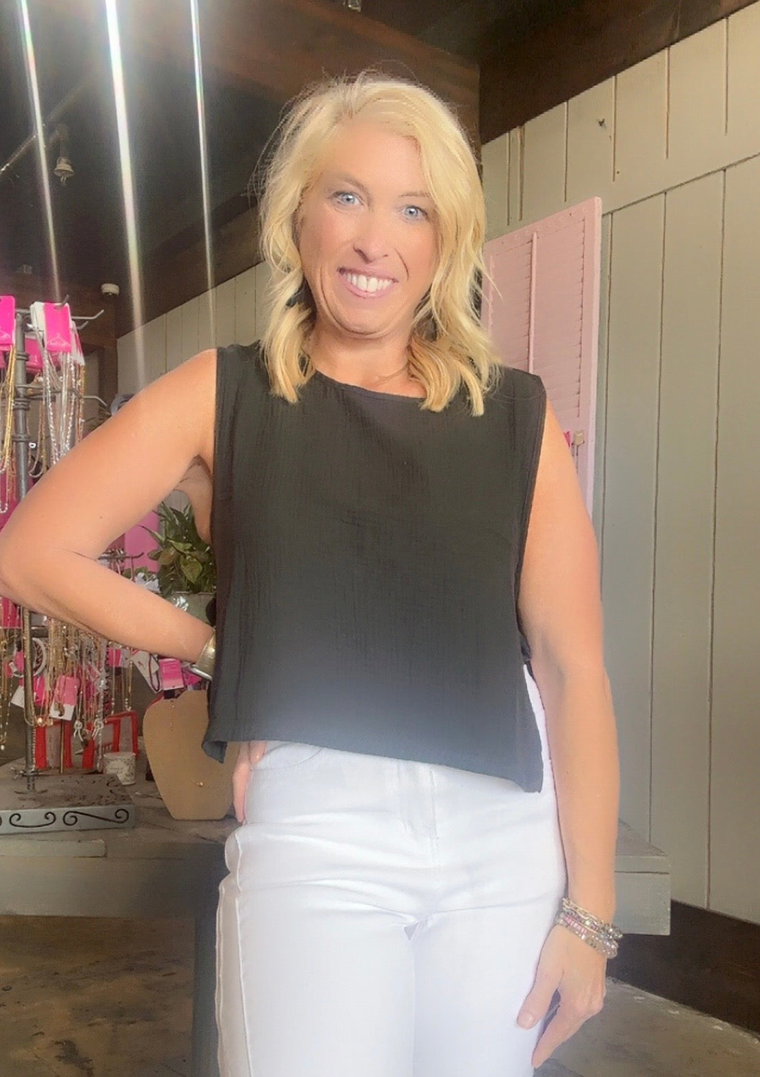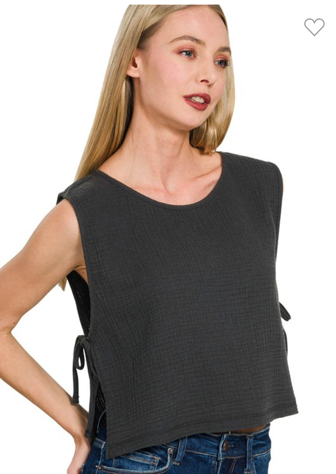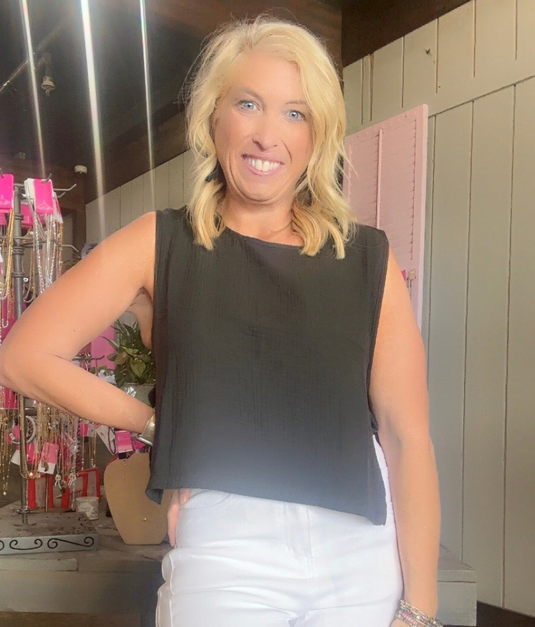Experience the ultimate comfort and style with Shae's double gauze side to sleeveless top. Made from high-quality fabric, it offers a soft and cozy feel, perfect for any season. Upgrade your wardrobe with this versatile top and elevate your fashion game!