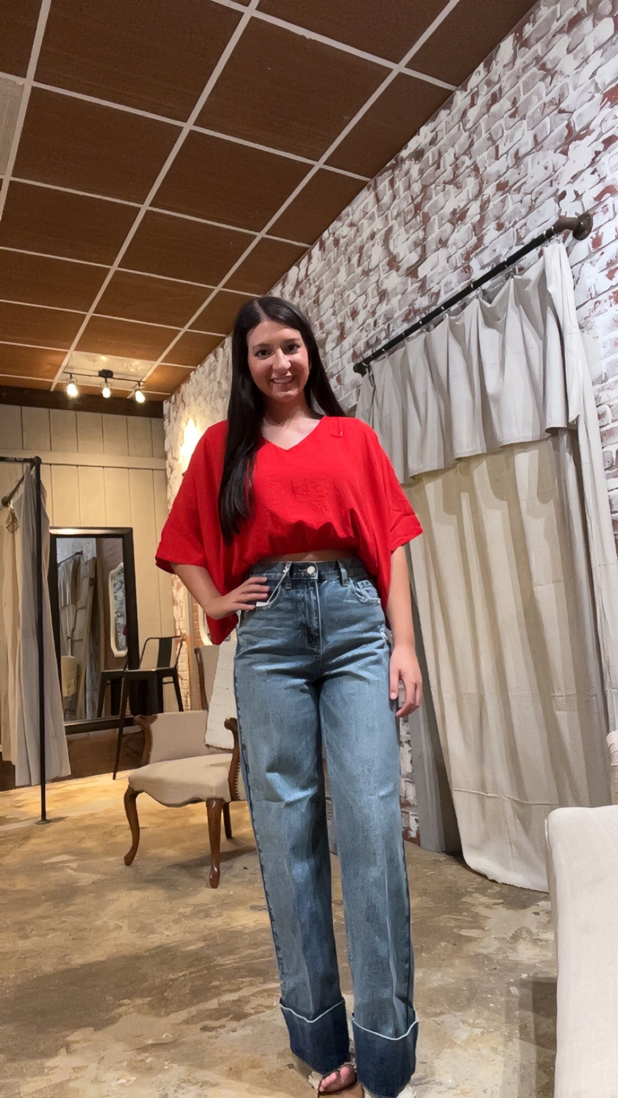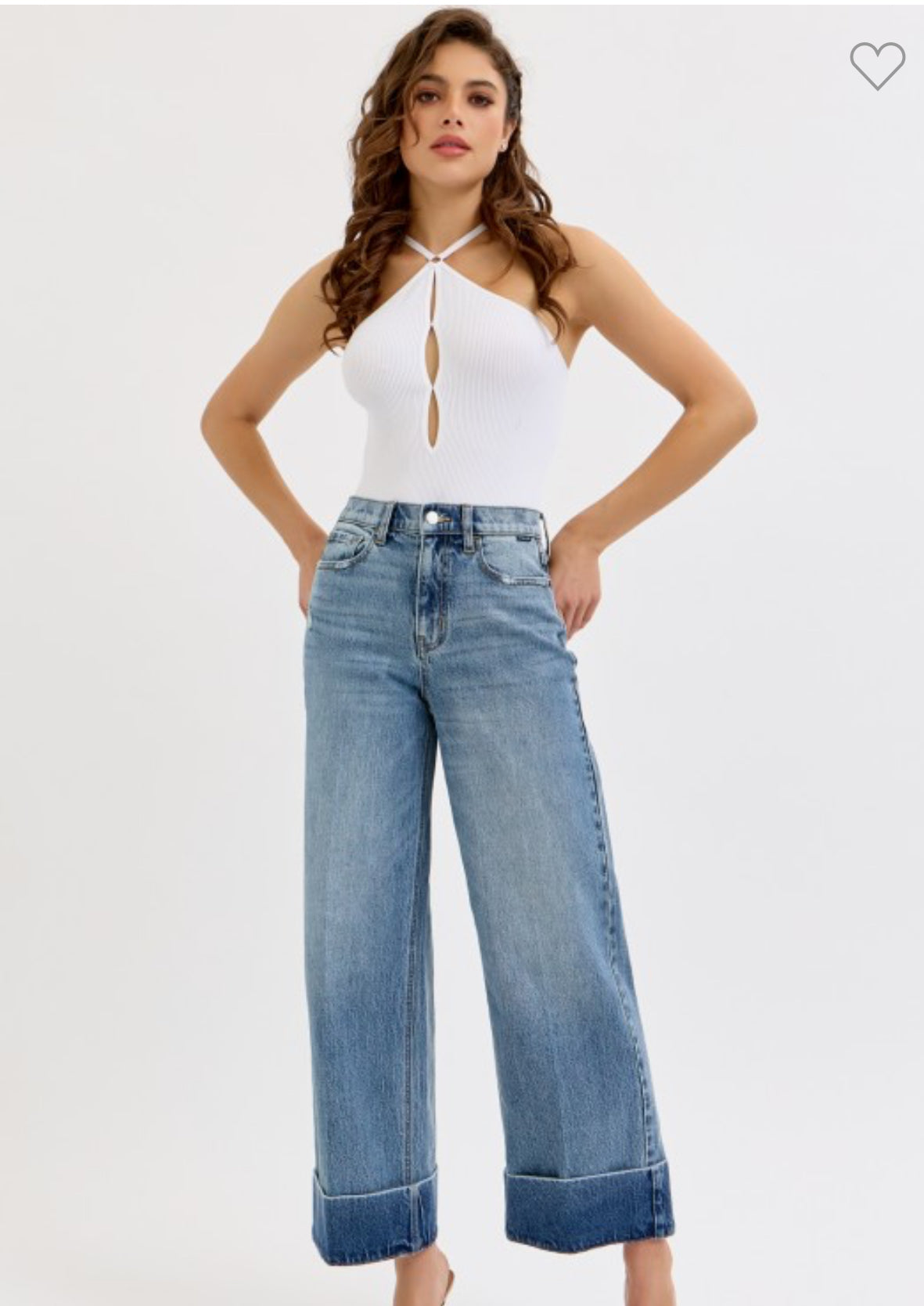 Introducing Sky High Rollers, the ultimate in style and comfort! Experience the high rise wide leg with self high cuff hem, 11 1/2 inch rise, and 30 inch inseam. Made of 99% cotton and 1% spandex, these jeans will elevate your wardrobe to new heights. Ready to roll?