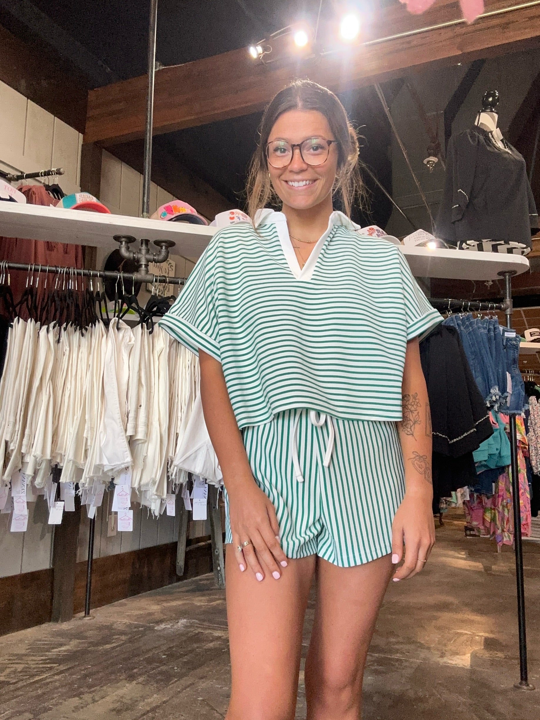Elevate your casual style with The Power Pair Set, featuring a chic stripped collared top and matching shorts. Crafted from a soft blend of 98% polyester and 2% spandex, this ensemble promises comfort and cuteness for those laid-back days. Feel confident and stylish effortlessly!