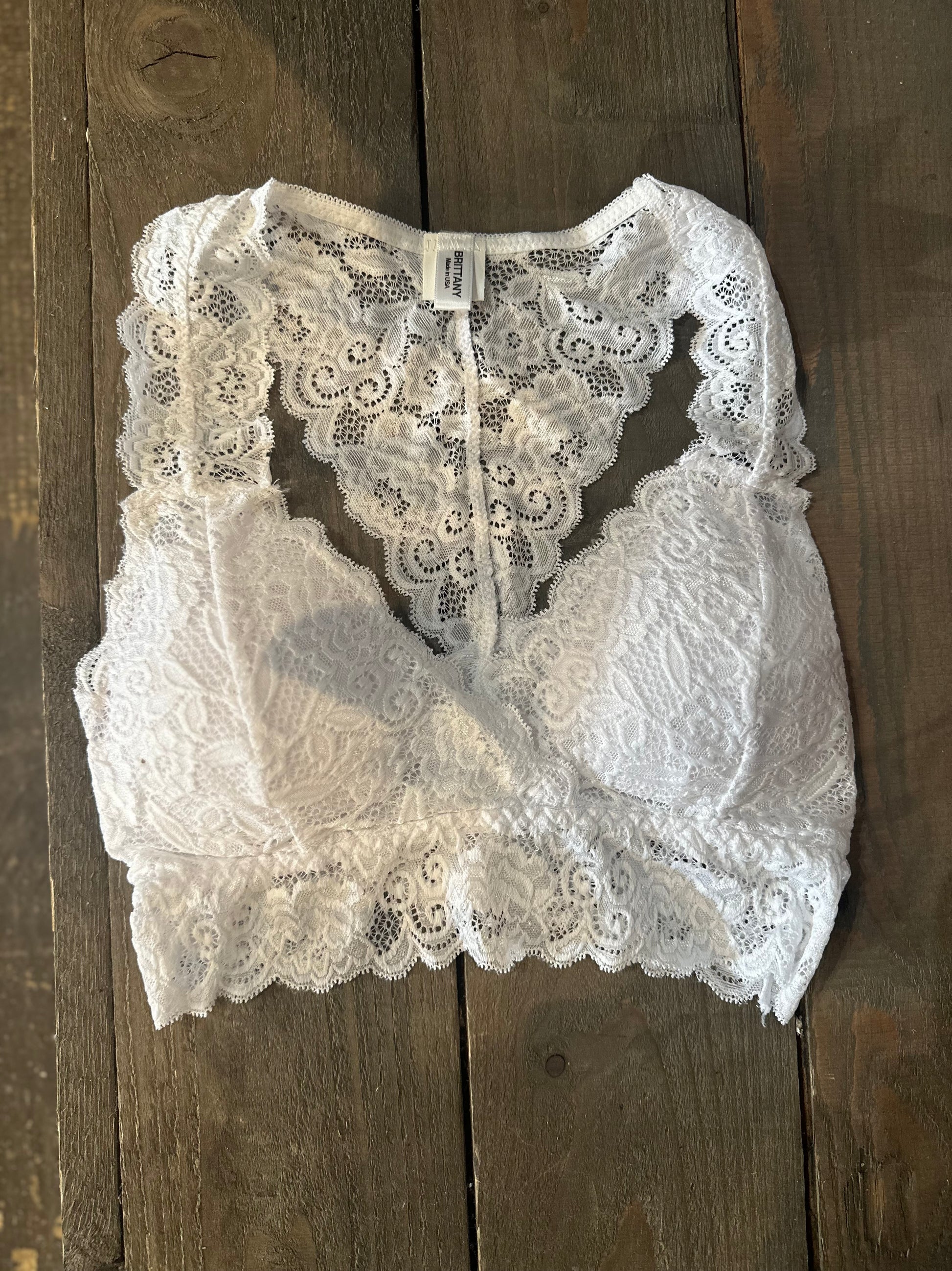 "Experience ultimate comfort and style with our White Lace Halter bralette! Made in the USA with moisture-wicking, soft fabric by Brittany Shapewear, this bralette offers both elegance and practicality. Stay cool and confident all day long!"